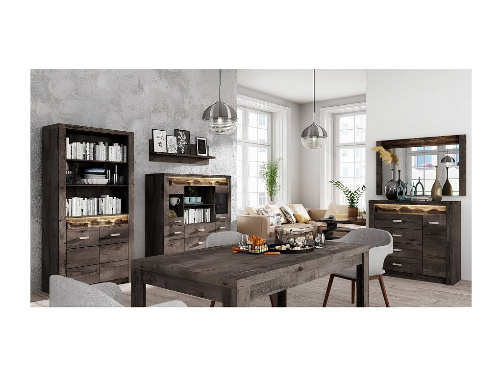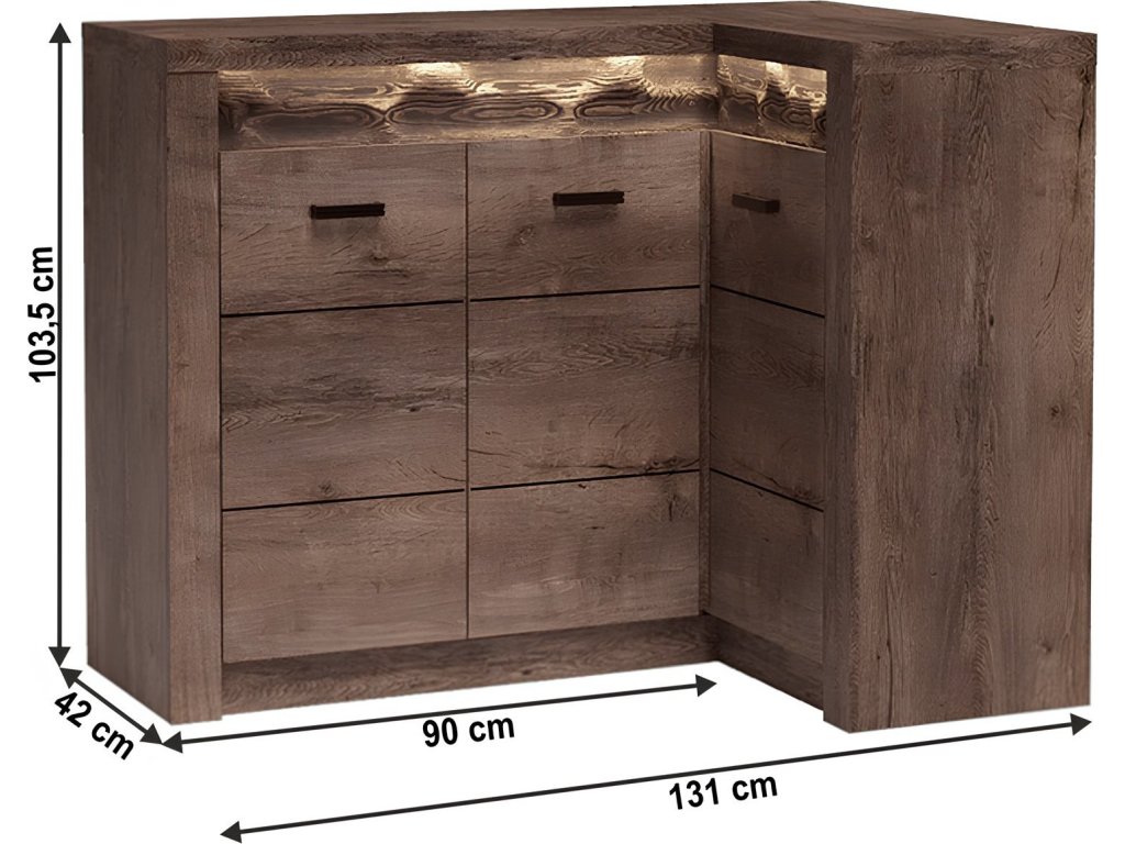 Rohová komoda 15 Korpus hrubý až 48 mm, Tloušťka materiálu zbývající části: 16 mm, úchytky kovové Materiál DTD laminovaná, ABS hrany, barevné provedení: jasan tmavý, Rozměry ŠxHxV: 131 / 90x42x103,5 cm. Možnost dokoupení LED osvětlení v ceně 1220 Kč. Dodávané v demontu.