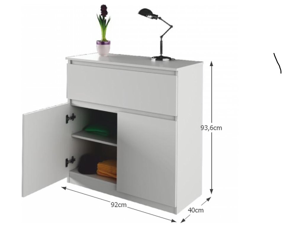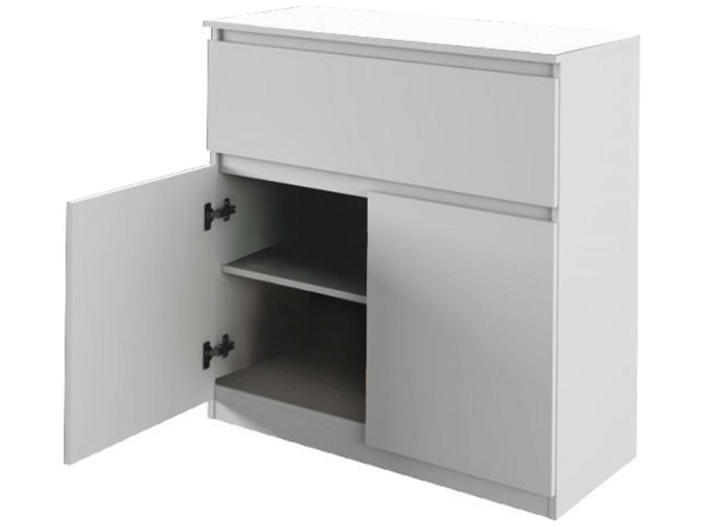 Komoda LOGAN NEW 02 dvoudveřová, s jedním šuplíkem. Barevné provedení: bílá Materiál: DTD laminovaná Rozměry (ŠxHxV): 92x40x93,6 cm Tloušťka materiálu: 16 mm Dodávané v demontu