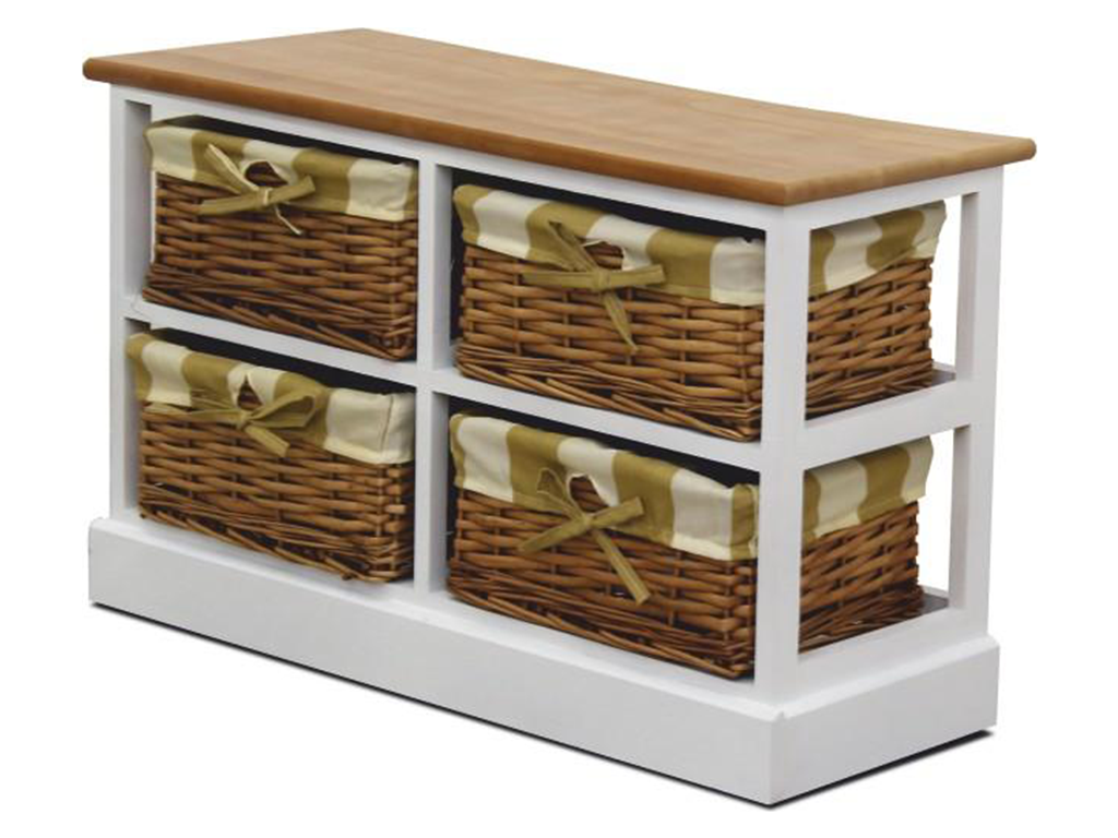 Komoda GINGER 4 se 4 proutěnými košíky v kombinaci bílé a medové barvy, Materiál dřevo / proutí / látka Rozměry (ŠxHxV): 71x28x43 cm Rozměry košíku (ŠxHxV): 31x23x14 cm Dodávané v montu