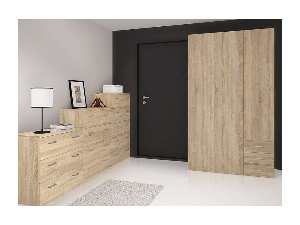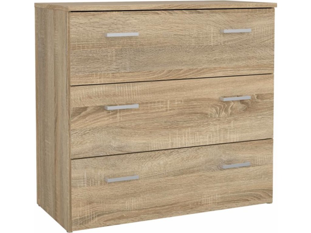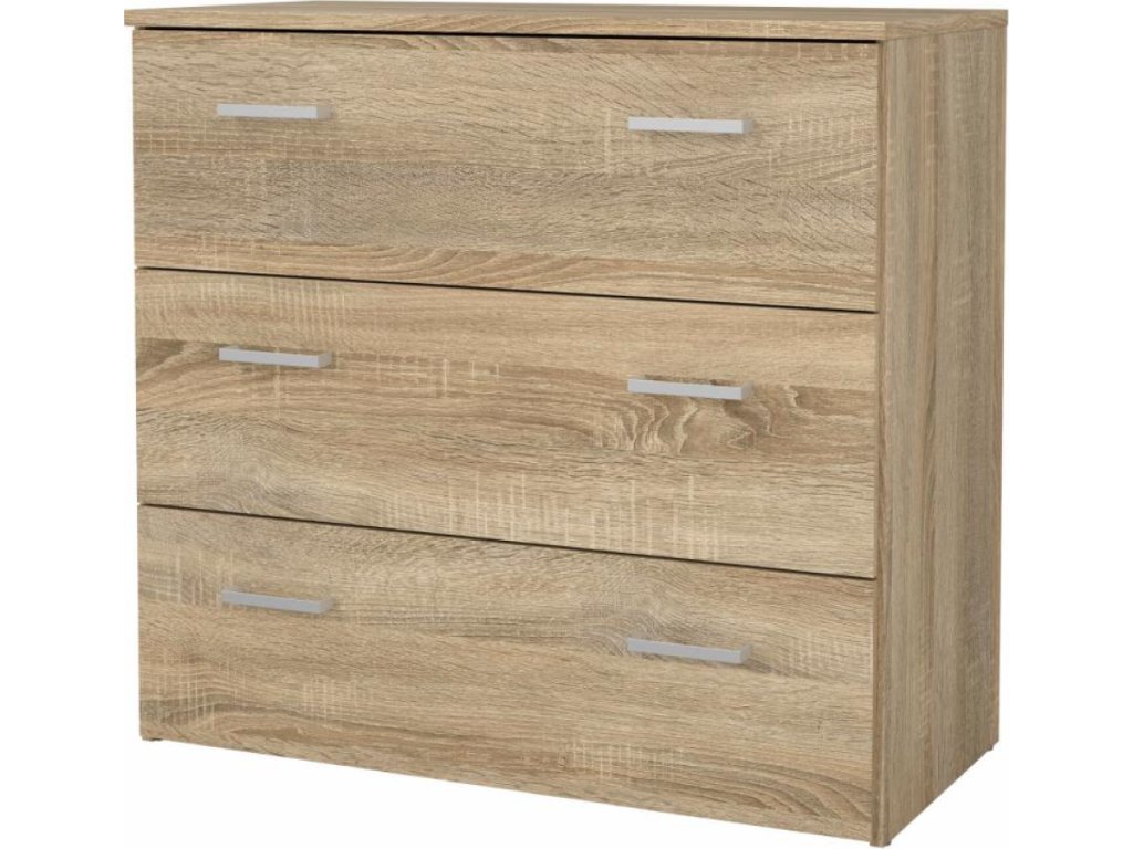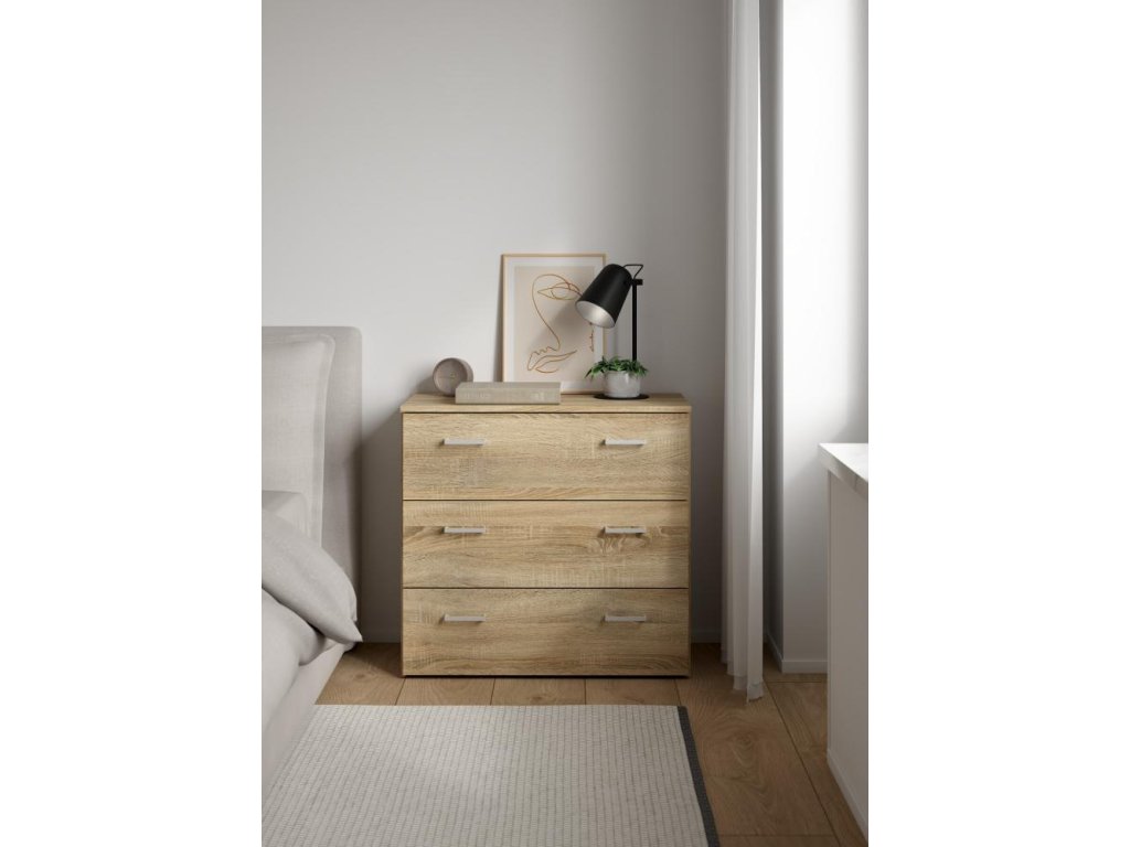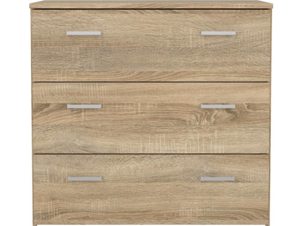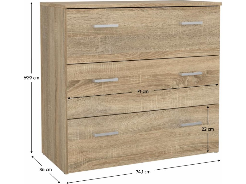 Komoda GARBO 3 Materiál: DTD laminovaná Provedení: dub sonoma Rozměry komody (ŠxHxV): 74,1x36x69,9 cm Rozměry šuplíku (ŠxV): 71x22 cm Tloušťka materiálu korpus: 12 mm Tloušťka materiálu vrchní plát: 15 mm 3 šuplíky Dodávané v demontu