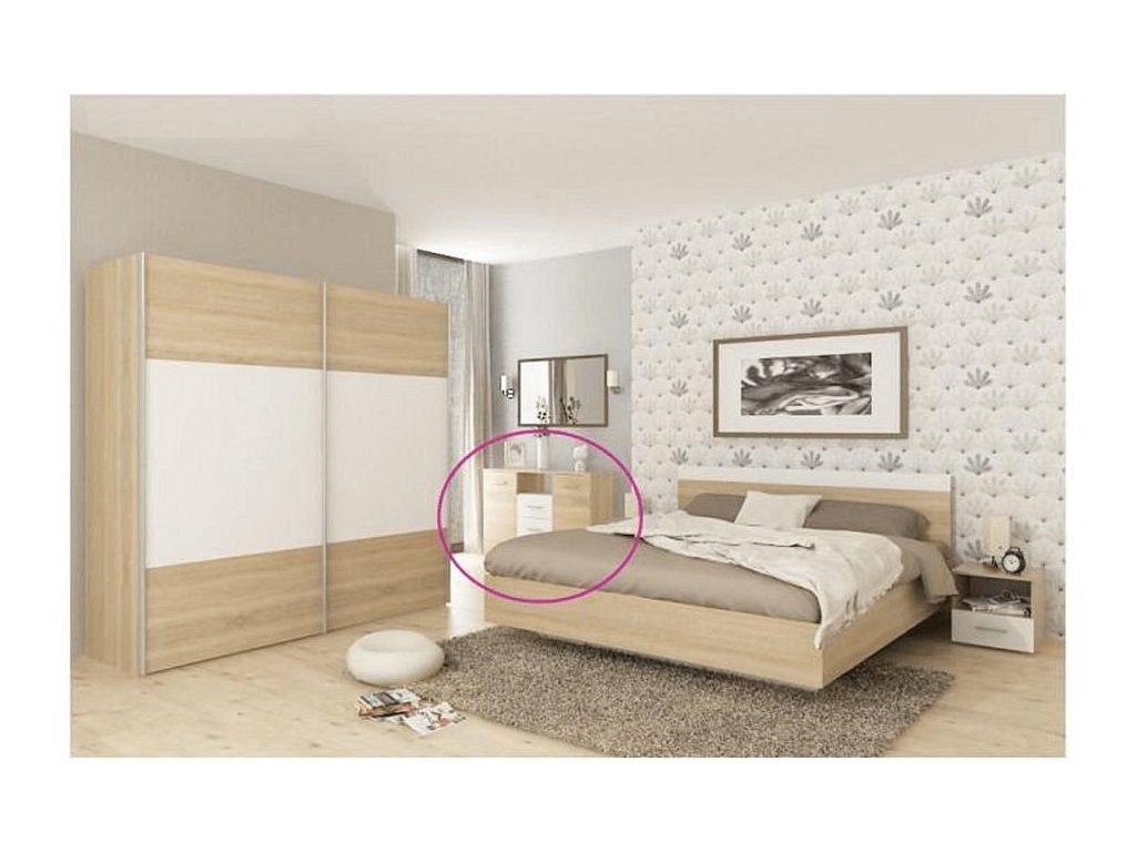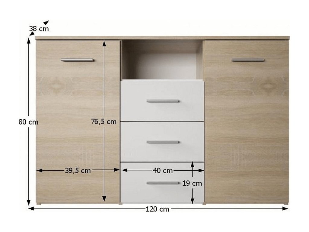 Komoda dvoudveřová s třemi šuplíky GABRIELA Materiál: DTD laminovaná Barva: dub sonoma / bílá Rozměry (ŠxHxV): 120x38x80 cm Tloušťka materiálu: 16 mm Dodávané v demontu.