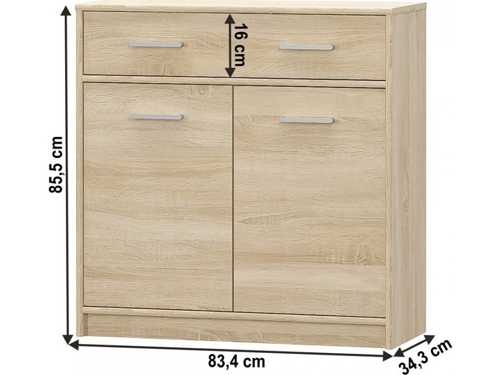 Komoda 2D1S TEYO Materiál: DTD laminovaná Barevné provedení: dub sonoma Rozměry (ŠxHxV): 83x34x85 cm Tloušťka materiálu: 16 mm Dodávána v demontu.
