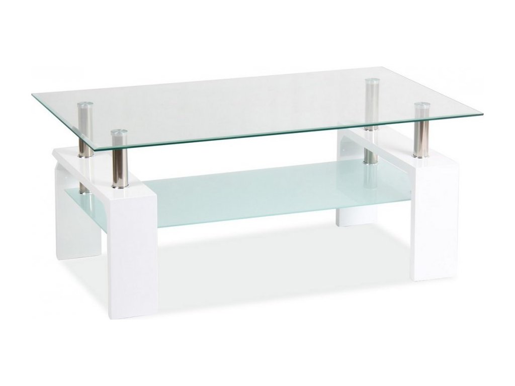 Stylový konferenční stolek v moderním provedení. Konstrukce MDF je v barvě bílý lak v kombinaci s pochromovaným kovem, vrchní deska ( 8 mm ) u stolu je z průhledného skla, odkládací polička je z mléčného skla. Sklo je tvrzené. Tento stolek lze objednat i v jiném provedení materiálu a barev.Doplňkové parametry