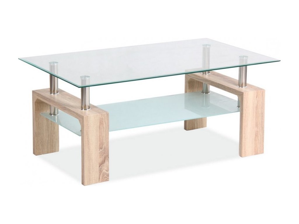 Stylový konferenční stolek v moderním provedení. Konstrukce MDF je v barvě dub sonoma v kombinaci s pochromovaným kovem, vrchní deska ( 8 mm ) u stolu je z průhledného skla, odkládací polička je z mléčného skla. Sklo je tvrzené. Tento stolek lze objednat i v jiném provedení materiálu a barev.Doplňkové parametry