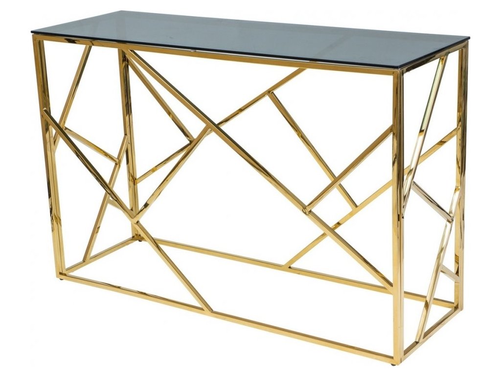 Konzolový stolek v moderním stylu glamour. Konstrukce je z kovu ve zlaté barvě, vrchní deska je z tvrzeného kouřového skla. Tento stylový kousek v netradičním designu se bude vyjímat v každém interiéru. Dodáváme v demontovaném stavu.Doplňkové parametry