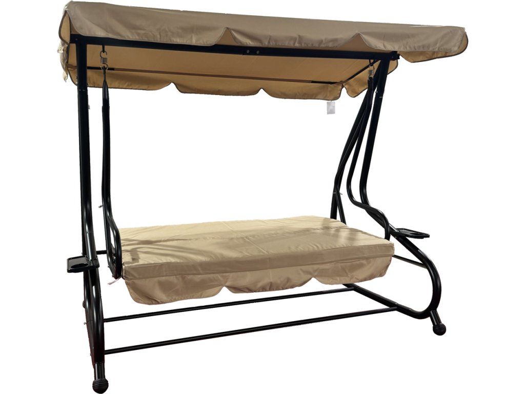 Ocelová konstrukce ošetřena práškovou barvou, podušky (voděodolný polyester 160 g), výplň polyesterová vata 8 cm, stříška (voděodolný polyester 180 g), pro 3 osoby