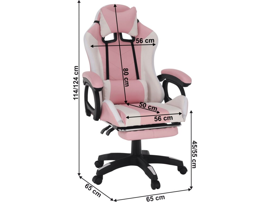 Materiál konstrukce: plast Barva: černá Materiál čalounění: ekokůže Oděruodolnost ekokůže podle testu Martindale: 100 000 oděrek Barva: růžová / bílá Rozměry (ŠxHxV): 65x65x114-124 cm Nastavitelná výška sedu: 45-55 cm Hloubka sedu: 50 cm Šířka sedu: 56 cm Výška zádové opěrky: 80 cm Šířka zádové opěrky: 56 cm Maximální nosnost: 150 kg LED RGB osvětlení Polohovací opěrka zad má sklon 90-135 ° Určeno pro dlouhé sezení Čalouněné područky provedení ekokůže Dřevěný nosný rám dva polštáře Odnímatelná a výškově nastavitelná opěrka hlavy Masážní bederní polštář 1 masážní bod plastová podstava výsuvná podnož Dodávána v demontu