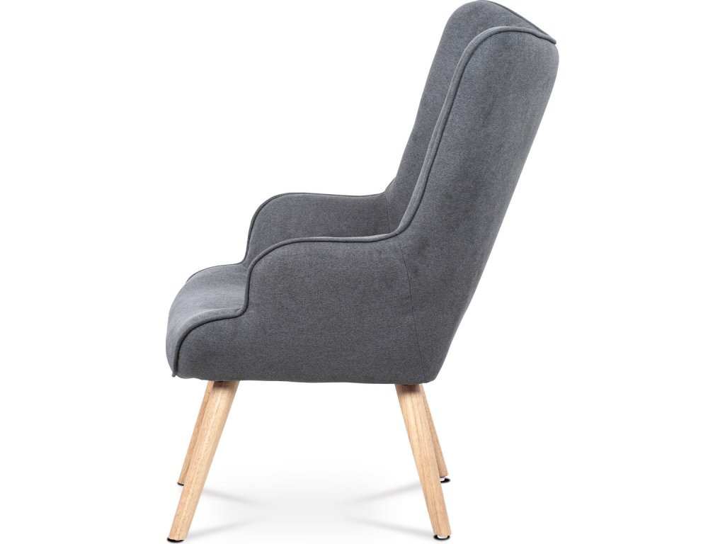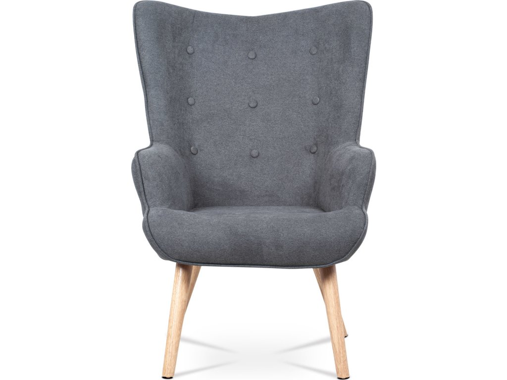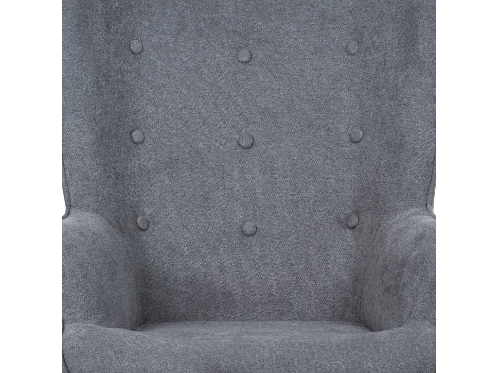Křeslo minimalistických linií ve skandinávském stylu. Vyniká vysokým prohnutým opěrákem, úzkými a krátkými područkami a dekorativními jemnými čalounickými vtahy zakončenými knoflíky na čelní straně opěráku. To vše vytváří charakteristické severské retro linie tohoto křesla. Nejen design, ale hlavně pohodlí které Vás obklopí při usednutí, bude příjemné zpestření při chvílích odpočinku a relaxace. A k jeho zvýšení výborně poslouží i čtyřnohá a polstrovaná podnožka na vyložení nohou, kterou ale můžete použít i jako příležitostný taburet. Potah je z tradiční šedé látky, kostra z masivního dřeva a výplň z kvalitní PU pěny. V místě sedáku jsou pro zkvalitnění sezení elastické popruhy. Dlouhé kónické dřevěné nohy jsou z masivního kaučukovníku v přírodním odstínu a lakované transparentním lakem. Aby bylo eliminováno poškození podlahové krytiny, jsou opatřeny plastovými kluzáky. U zadních nohou rektifikovatelnými. Nosnost křesla je 120 kg.Doplňkové parametry