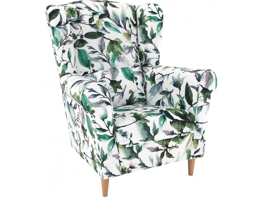 Křeslo ušák, látka vzor listí - nožičky dřevěné, CHARLOT
