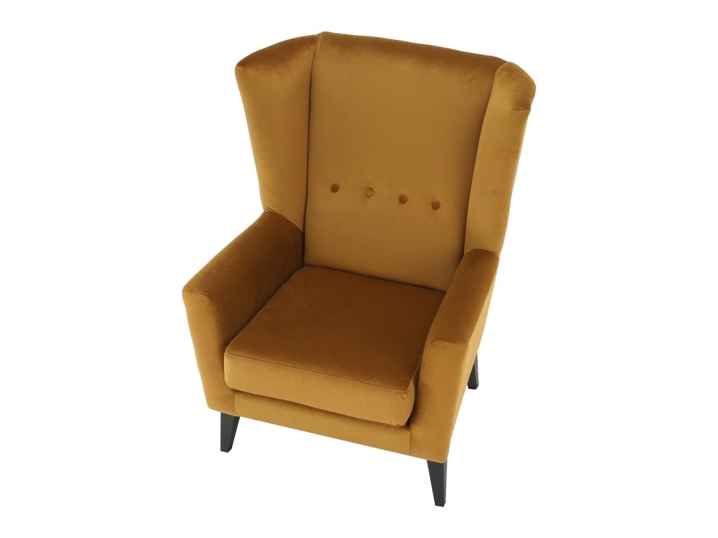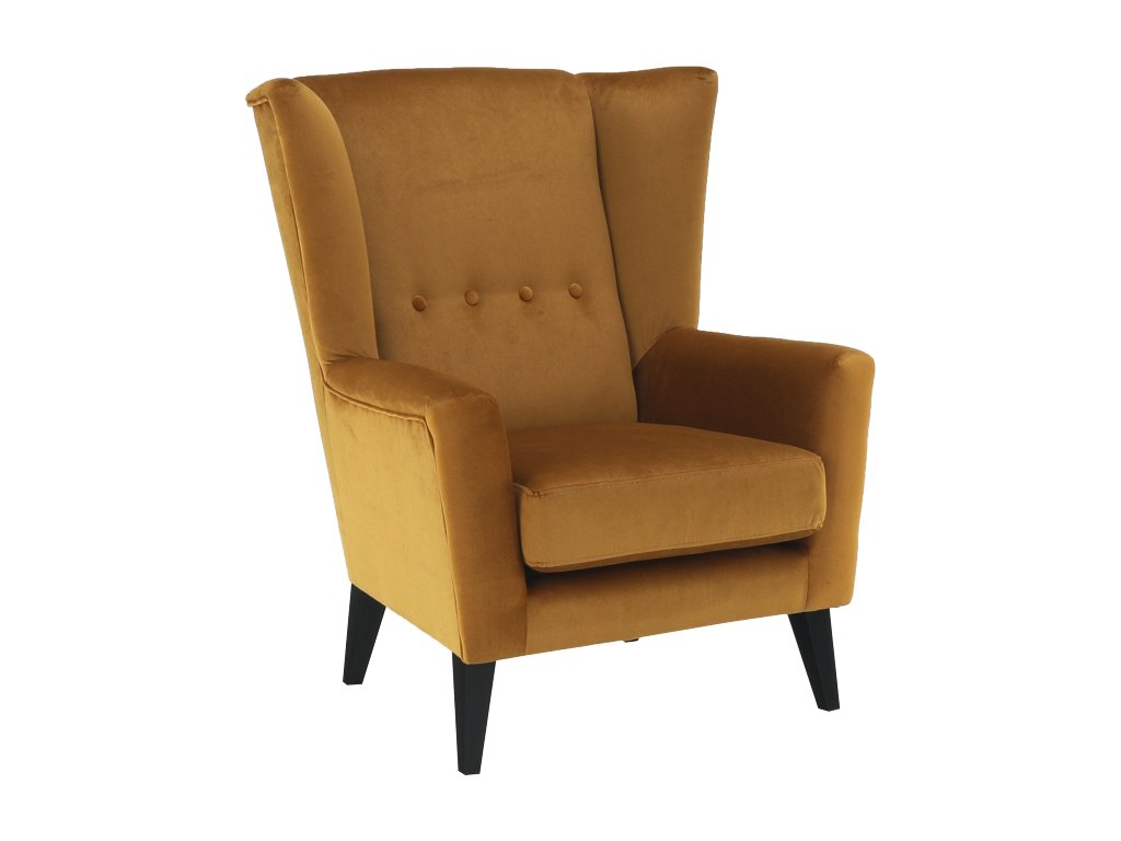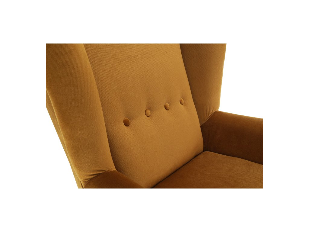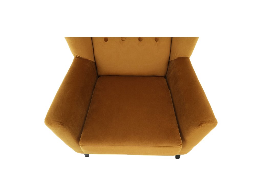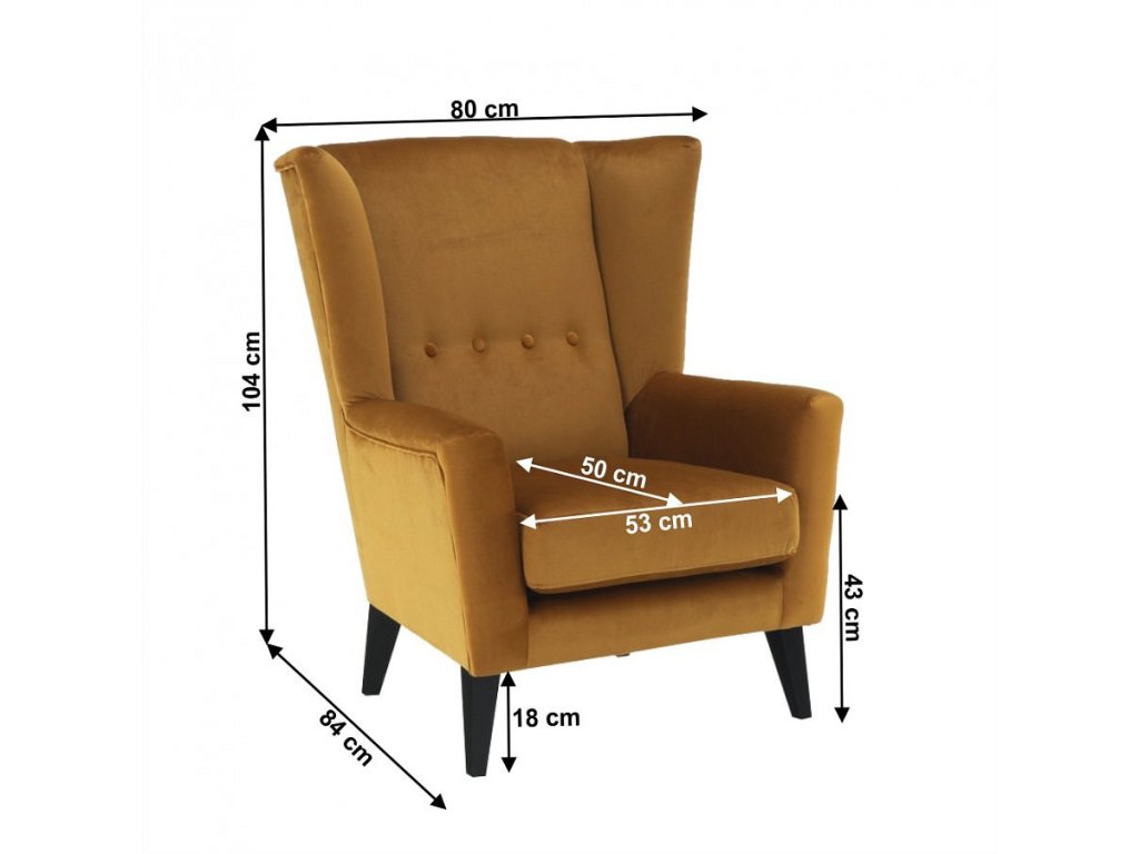 Materiál: látka Kronos 01 / dřevo Oděruodolnost textilie podle testu Martindale: 60 000 oděrek Barva: měděná / černá Rozměry křesla (ŠxHxV): 80x84x104 cm Výška sedu: 43 cm Hloubka sedu: 50 cm Šířka sedu: 53 cm Výška spodního prostoru od podlahy: 18 cm Nosnost: 120 kg vysoké opěradlo ozdobné knoflíky Dodávané v demontu