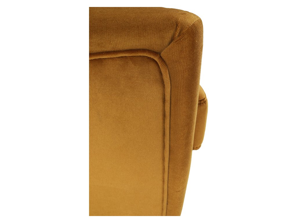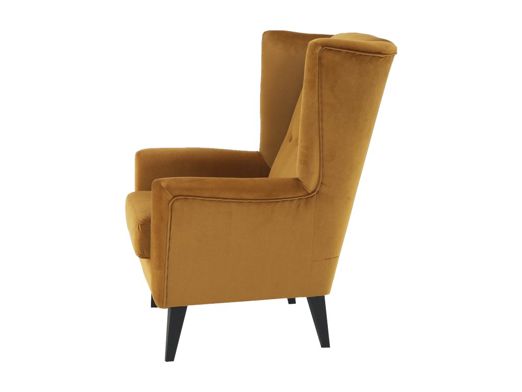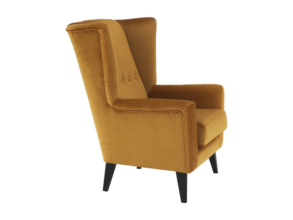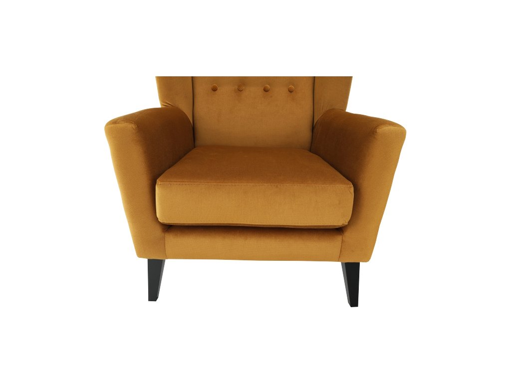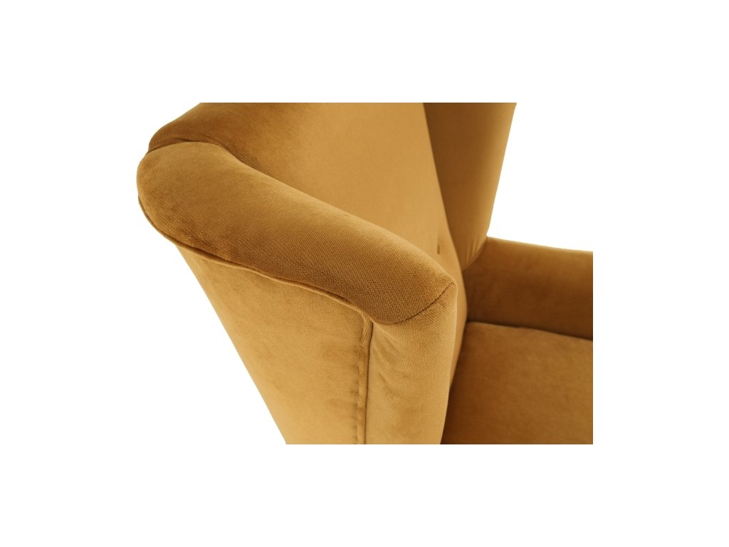 Materiál: látka Kronos 01 / dřevo Oděruodolnost textilie podle testu Martindale: 60 000 oděrek Barva: měděná / černá Rozměry křesla (ŠxHxV): 80x84x104 cm Výška sedu: 43 cm Hloubka sedu: 50 cm Šířka sedu: 53 cm Výška spodního prostoru od podlahy: 18 cm Nosnost: 120 kg vysoké opěradlo ozdobné knoflíky Dodávané v demontu