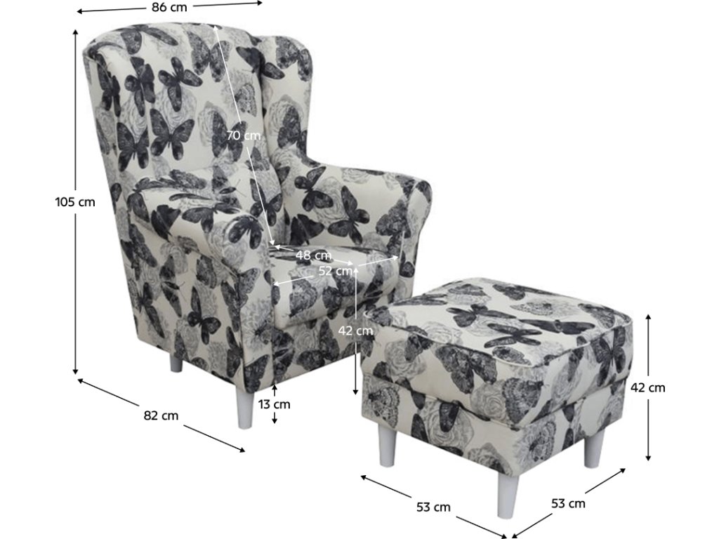 ;"Pohodlné křeslo - ušák s taburetem ASTRID Provedení: látka butterfly 1 šedá s bílou - nožičky dřevěné v bílé barvě Oděruodolnost textilie podle testu Martindale: 85 000 oděrek Rozměry (ŠxHxV): křeslo - 86x72x105 cm Výška sedu: 42 cm Hloubka sedu: 48 cm Taburet (ŠxHxV): 53x53x42 cm Výška spodního prostoru od podlahy: 13 cm Nosnost křesla: 120 kg Nosnost taburetu: 90 kg Dodávané v demontu. Možnost objednání v 6 barevných provedeních látky alova v ceně 9.190 Kč nebo látky Soro v ceně 9.680 Kč. Při individuální objednávce je třeba zaplatit 10% zálohu z dané částky. Po uhrazení zálohy bude Vaša objednávka zadána do výroby. Doba dodání 8-10 týdnů.