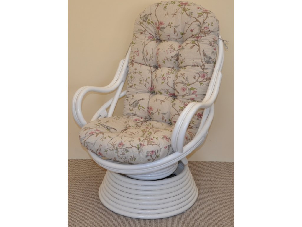 Ratanové houpací křeslo Swivel bílé polstr motiv ptáci