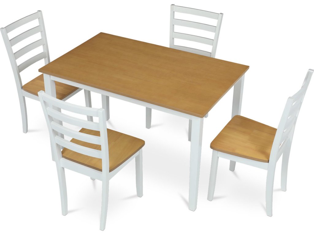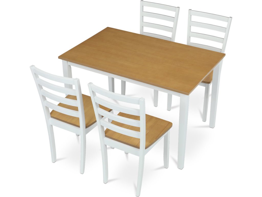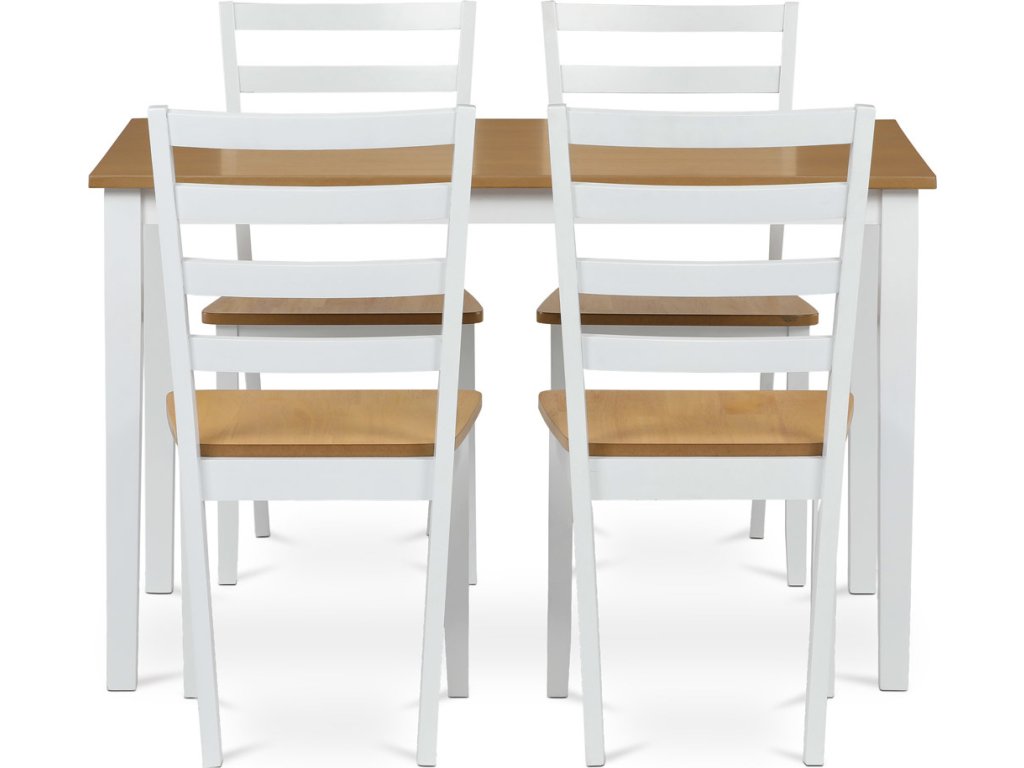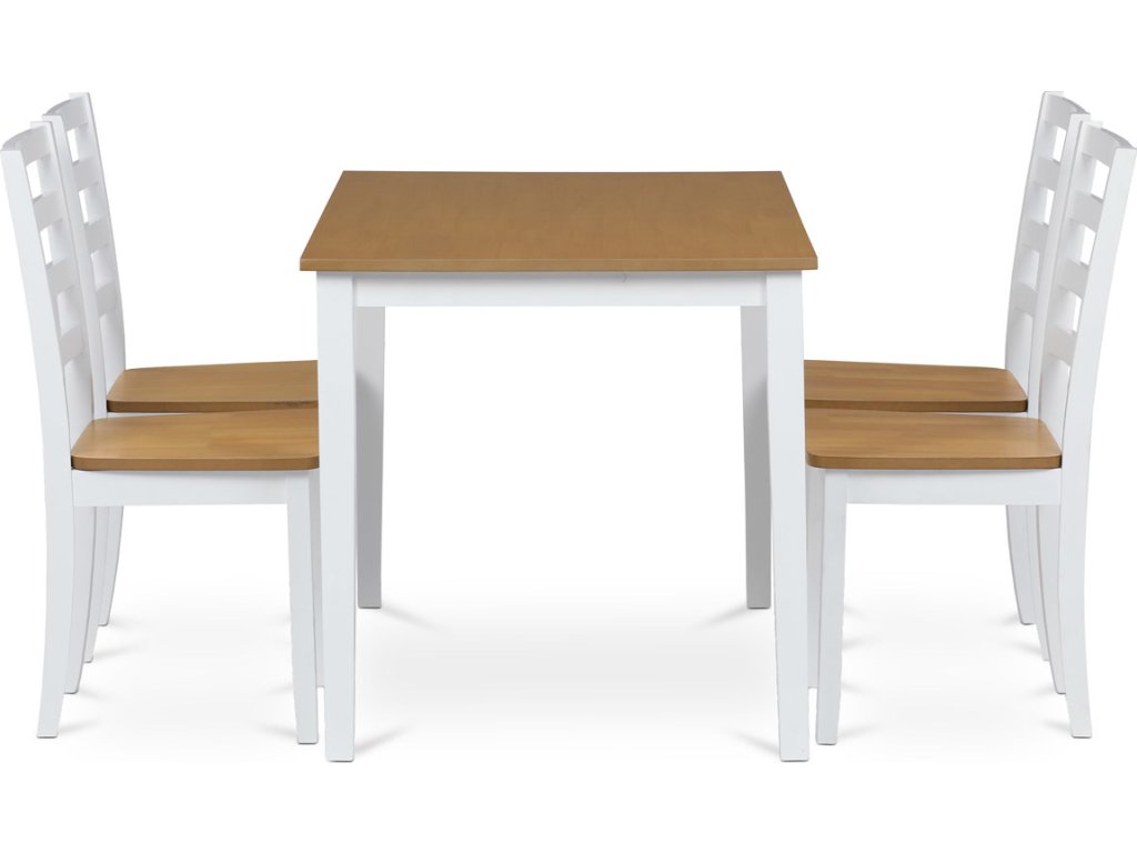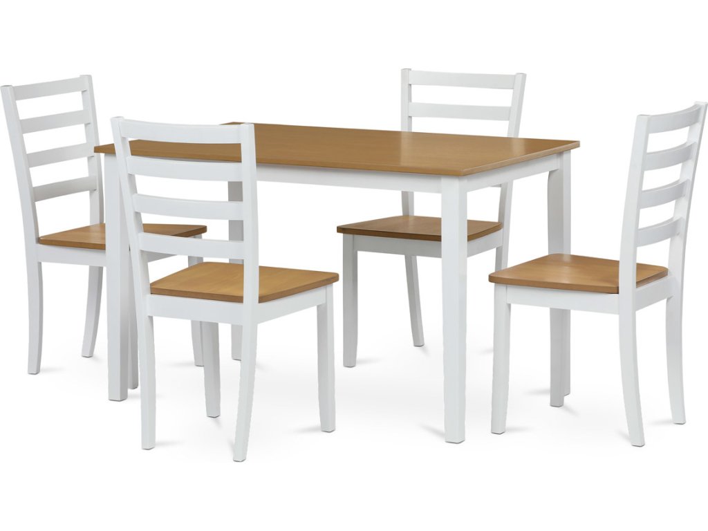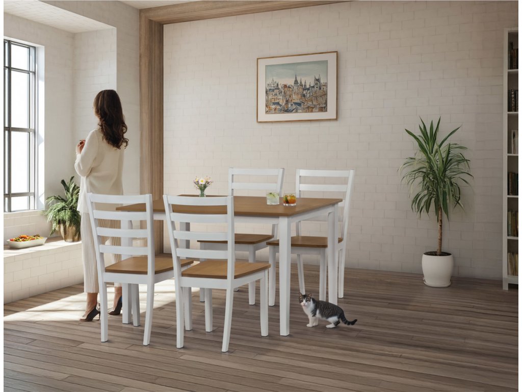Vneste do svého domova harmonii s elegantním jídelním setem značky Autronic. Kombinace bílých masivních nohou a desky v přírodním dubovém dekoru přidá vašemu interiéru moderní a svěží vzhled. Set zahrnuje stůl a čtyři židle, které nabízí pohodlí a stabilitu díky preciznímu zpracování z MDF materiálu s dýhou a masivním dřevem. Tento jídelní set je ideální volbou pro rodinné večeře i posezení s přáteli. Vytvořte si stylovou a funkční jídelnu s nadčasovým designem!Doplňkové parametry