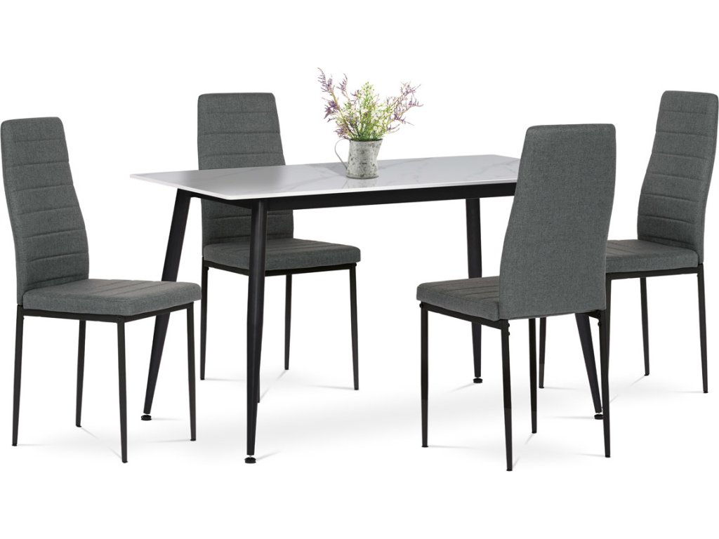 Moderní jídelní set Autronic v industriálním stylu je skvělou volbou pro vaši jídelnu. Obdélníkový stůl s deskou ze slinuté keramiky v bílém mramorovém dekoru působí elegantně a je odolný vůči poškrábání. Stabilitu zajišťují černé kovové nohy s jemně kónickým tvarem. Pohodlné židle mají čalounění z hladké šedé látky a ergonomicky tvarovanou opěrku pro maximální komfort. Černé kovové nohy ladí se stolem a dodávají celku jednotný vzhled. Ideální volba pro stylové a funkční stolování.Doplňkové parametry