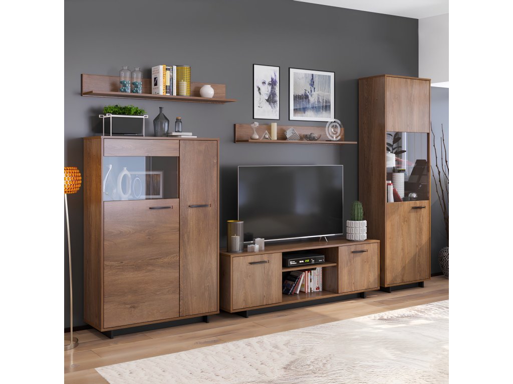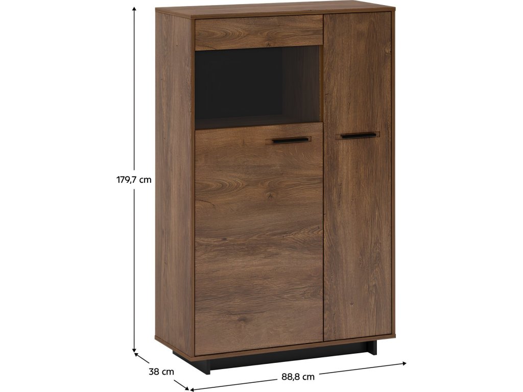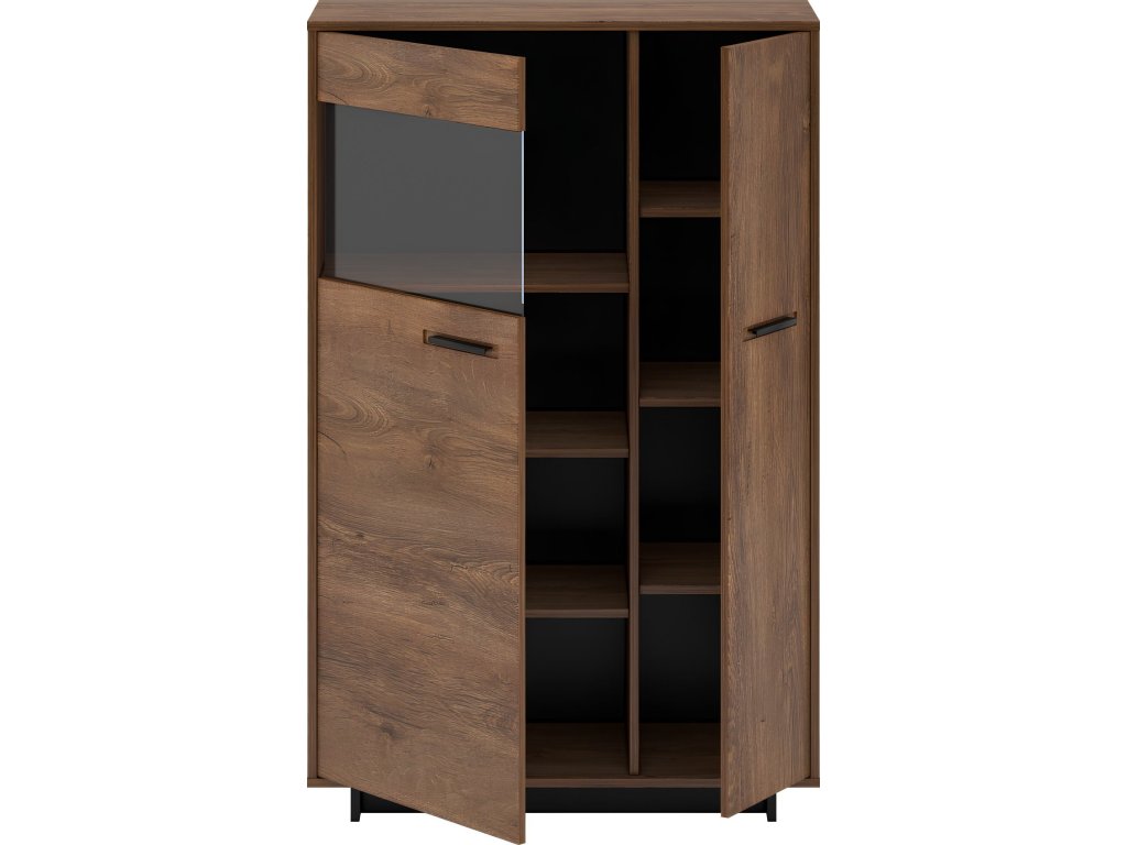 Materiál: DTD laminovaná / MDF / sklo Barva: dub bolzano / černá Rozměry (ŠxHxV): 88,8x38x140 cm Tloušťka materiálu: 16 mm dvoudveřová Dvířka v kombinaci se sklem policová 6 police z DTD na podstavci Výška spodního prostoru od podlahy: 5 cm kovové úchytky levé provedení Bez LED osvětlení Možnost dokoupit LED osvětlení v bílé barvě originální design Krásná kresba dřeva Do tradičního i moderního interiéru Do obývacího pokoje, pracovny i jídelny Dodávána v demontu