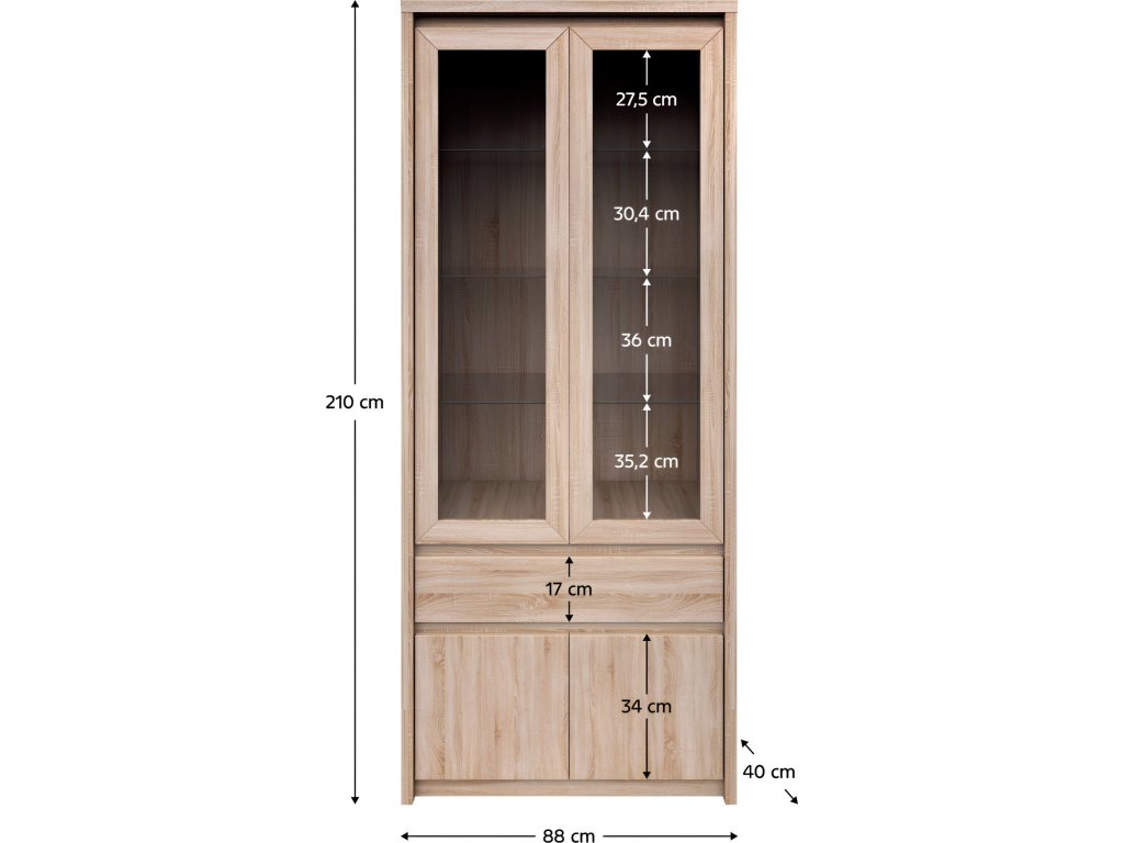 Vitrína s šuplíkem 2D2W1S NORTY TYP 3 Materiál: DTD laminovaná Provedení: dub sonoma Rozměry (ŠxHxV): 88x40x210 cm Tloušťka materiálu: 32 mm Tloušťka materiálu zbývající části: 16 mm Dodávané v demontu.