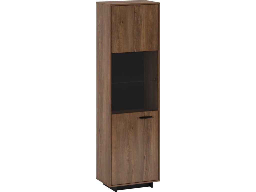 Materiál: DTD laminovaná / MDF fóliovaná/ sklo Barva: dub bolzano / černá Rozměry (ŠxHxV): 58,9x38x201,2 cm Tloušťka materiálu: 16 mm jednodveřová Dvířka v kombinaci se sklem policová 3 police z DTD, 1 skleněná police na podstavci Výška spodního prostoru od podlahy: 5 cm kovová úchytka levé provedení Bez LED osvětlení Možnost dokoupit LED osvětlení v bílé barvě originální design Krásná kresba dřeva Do tradičního i moderního interiéru Do obývacího pokoje, pracovny i jídelny Dodávána v demontu