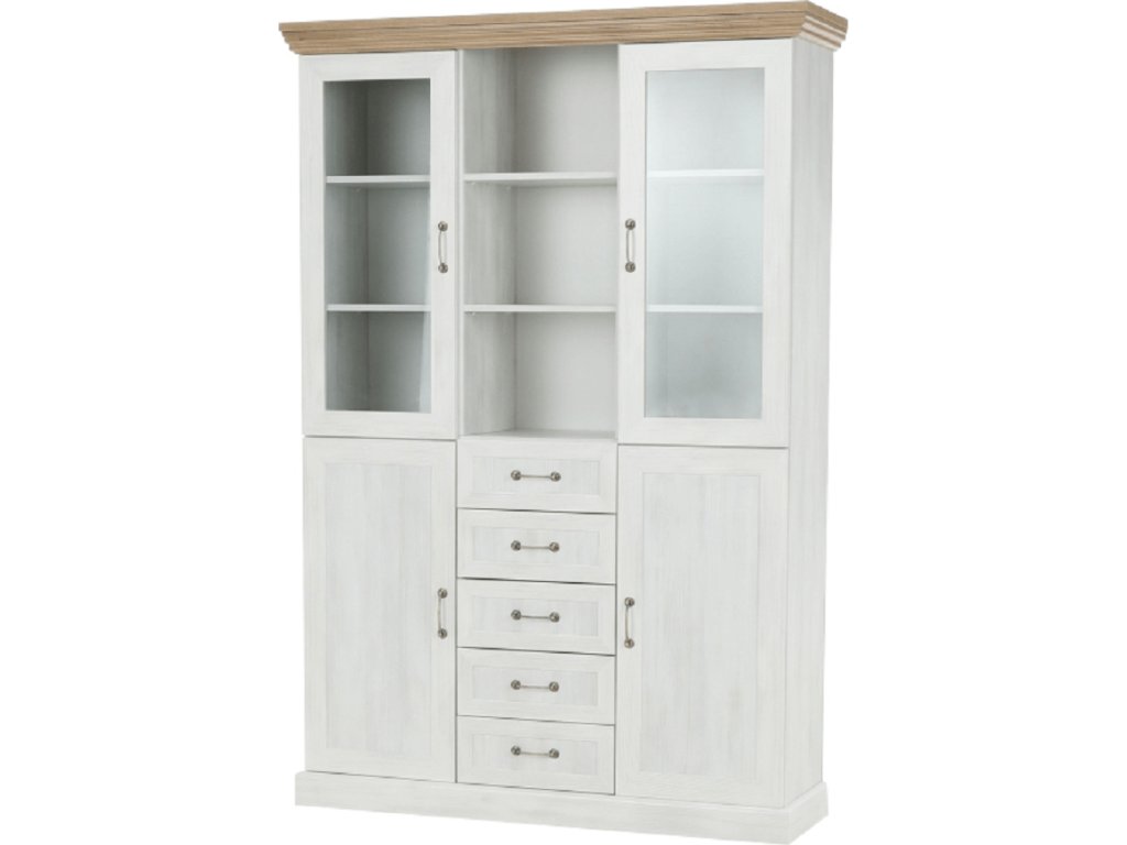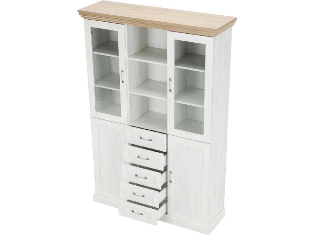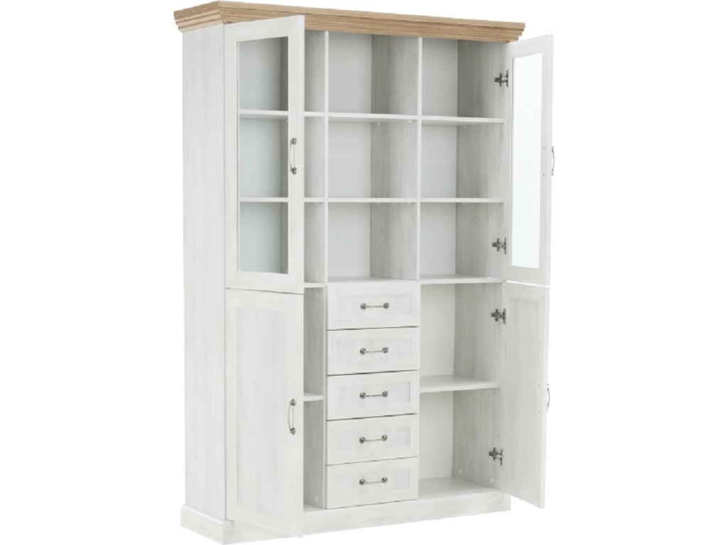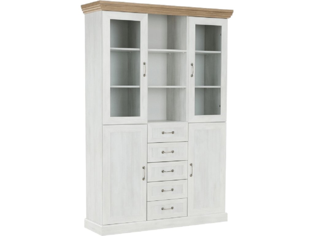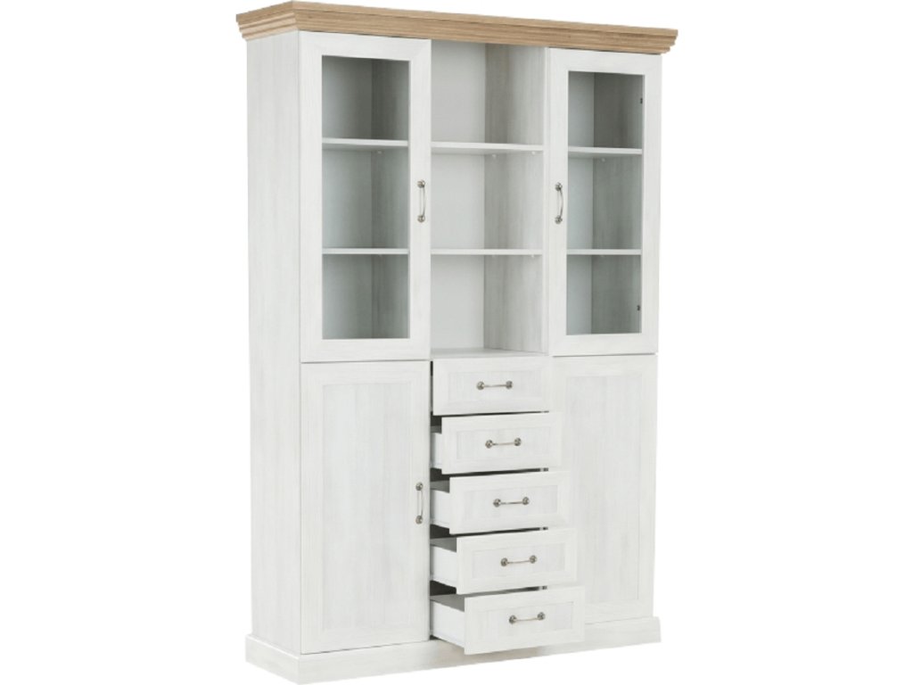 Vitrína W2D, čtyři skříní, pět šuplíků, otevřený úložný prostor s policemi z elegantního sektorového systému Royal v provensálském stylu. Vhodný na zařízení obývacích pokojů či ložnic. Materiál: korpus DTD laminovaná + ozdobné lišty, kovové úchytky Barevné provedení: sosna skandinávská v kombinaci s dubem divokým. Rozměry ŠxHxV: 127x39x187 cm Tloušťka materiálu korpus: 15 mm Tloušťka materiálu vrchní desky: 22 mm Dodávané v demontu .
