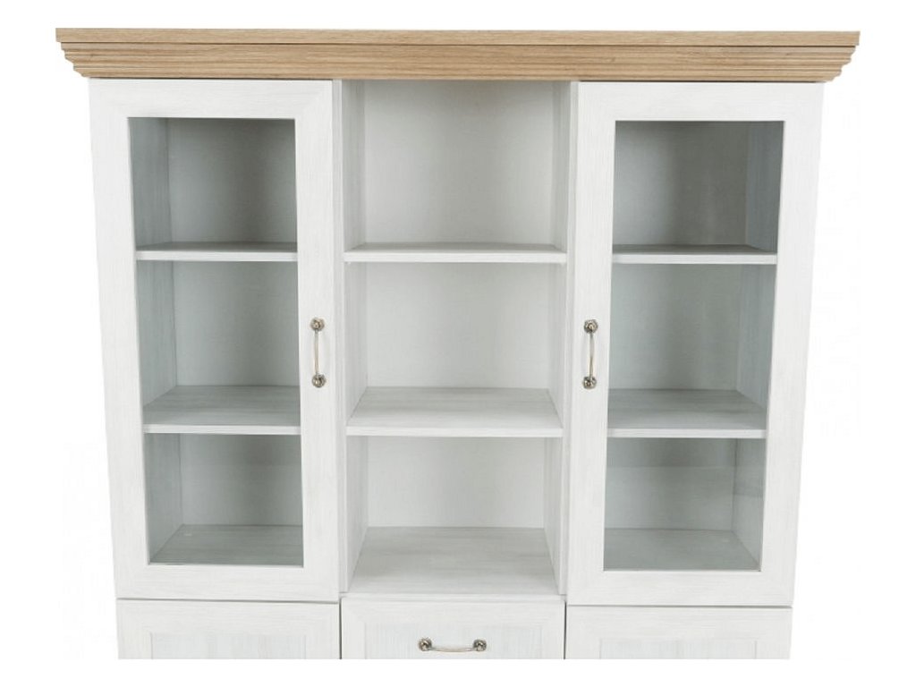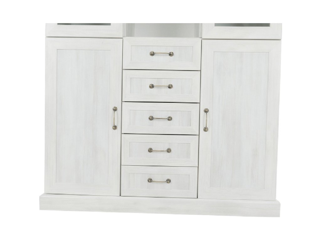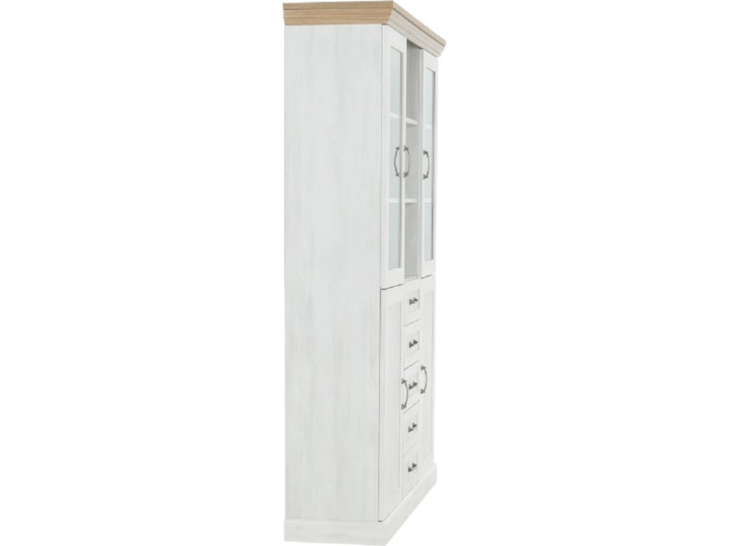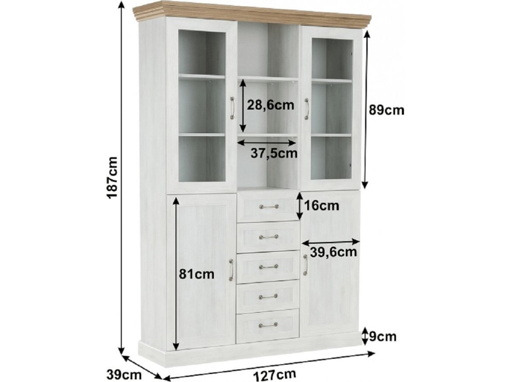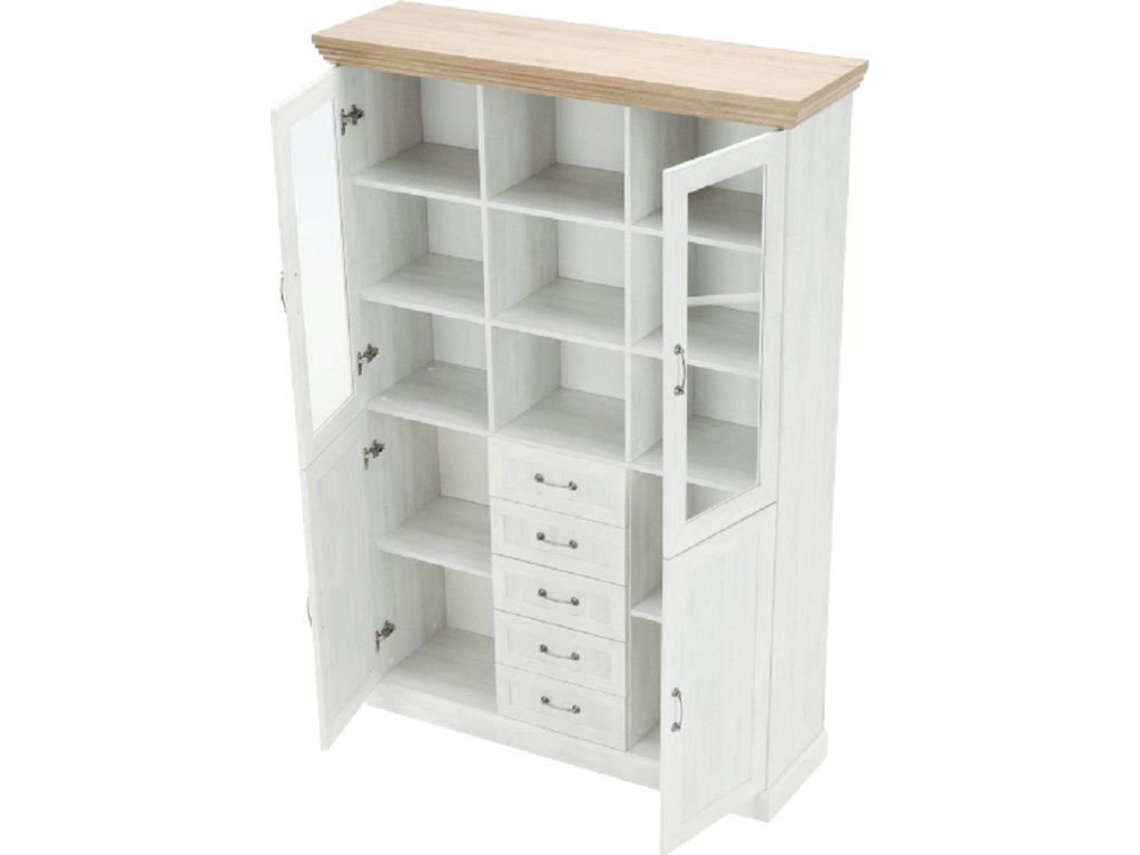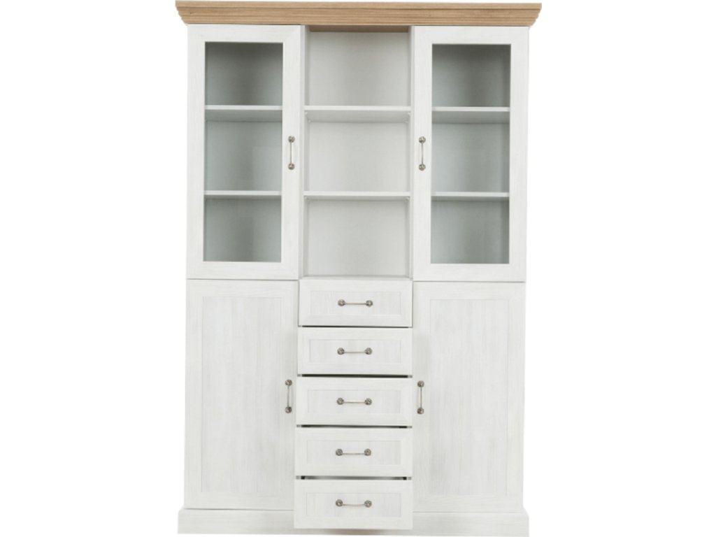 Vitrína W2D, čtyři skříní, pět šuplíků, otevřený úložný prostor s policemi z elegantního sektorového systému Royal v provensálském stylu. Vhodný na zařízení obývacích pokojů či ložnic. Materiál: korpus DTD laminovaná + ozdobné lišty, kovové úchytky Barevné provedení: sosna skandinávská v kombinaci s dubem divokým. Rozměry ŠxHxV: 127x39x187 cm Tloušťka materiálu korpus: 15 mm Tloušťka materiálu vrchní desky: 22 mm Dodávané v demontu .