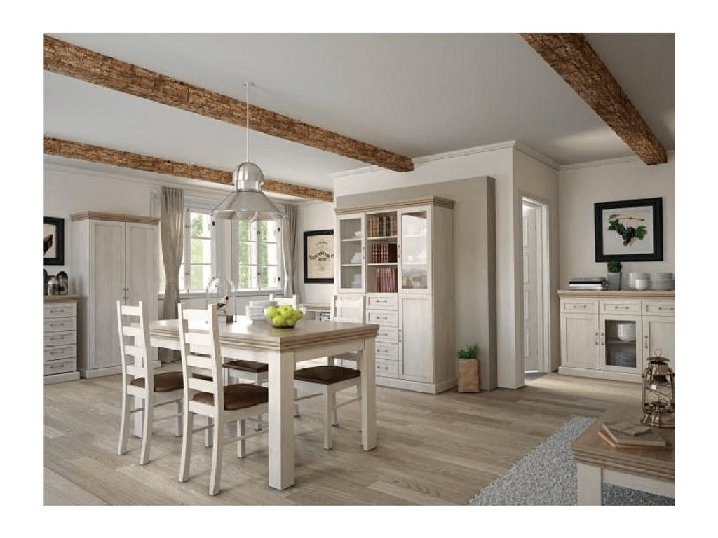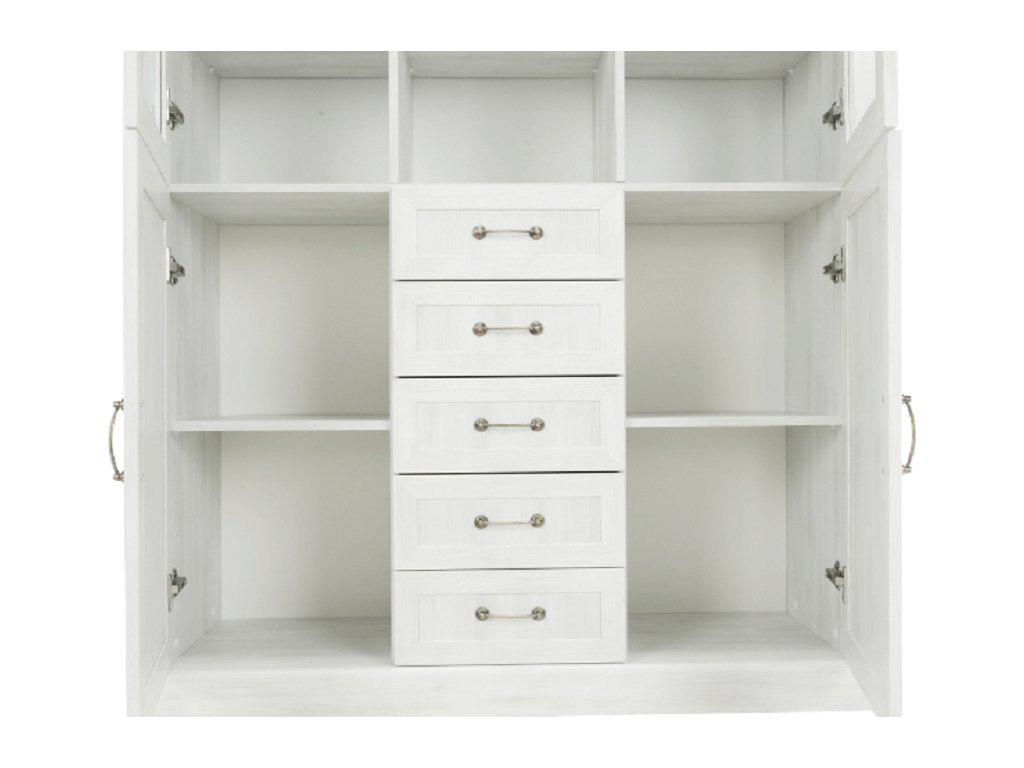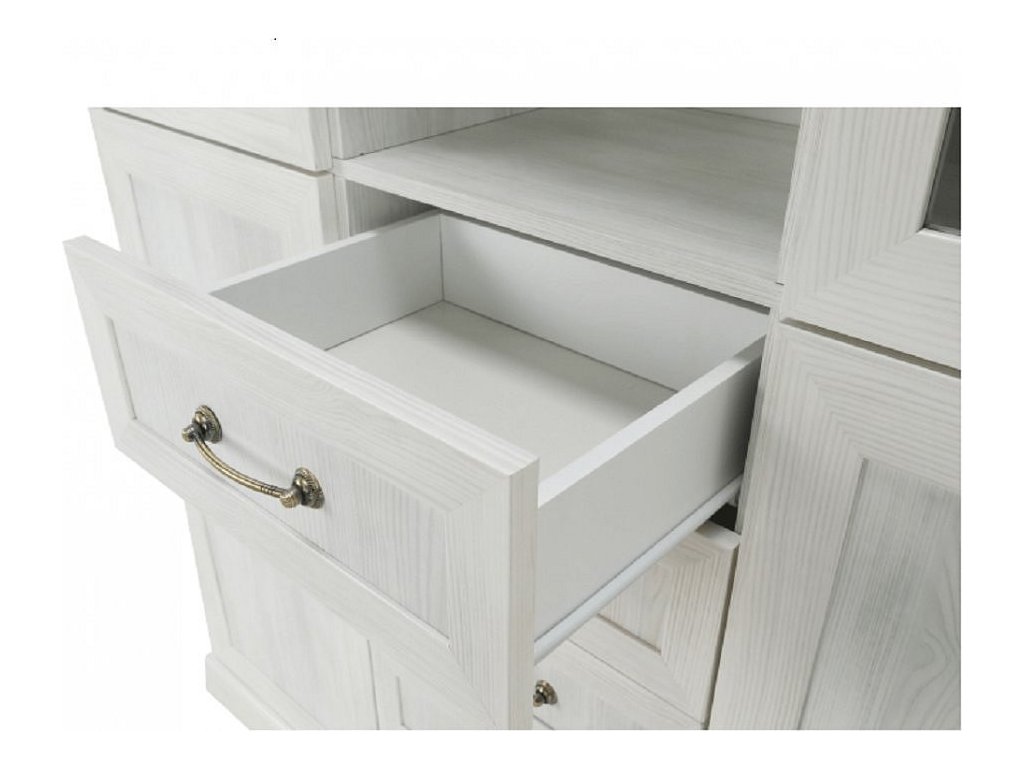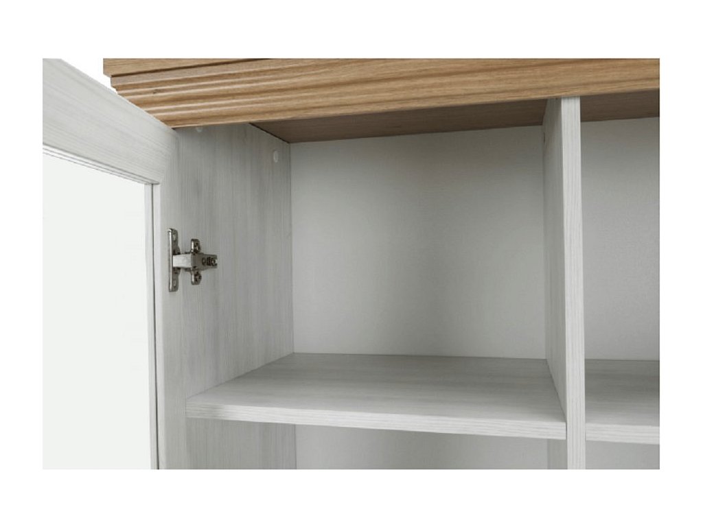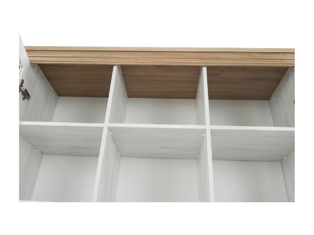 Vitrína W2D, čtyři skříní, pět šuplíků, otevřený úložný prostor s policemi z elegantního sektorového systému Royal v provensálském stylu. Vhodný na zařízení obývacích pokojů či ložnic. Materiál: korpus DTD laminovaná + ozdobné lišty, kovové úchytky Barevné provedení: sosna skandinávská v kombinaci s dubem divokým. Rozměry ŠxHxV: 127x39x187 cm Tloušťka materiálu korpus: 15 mm Tloušťka materiálu vrchní desky: 22 mm Dodávané v demontu .