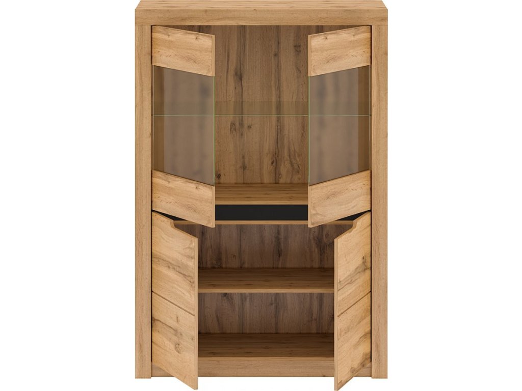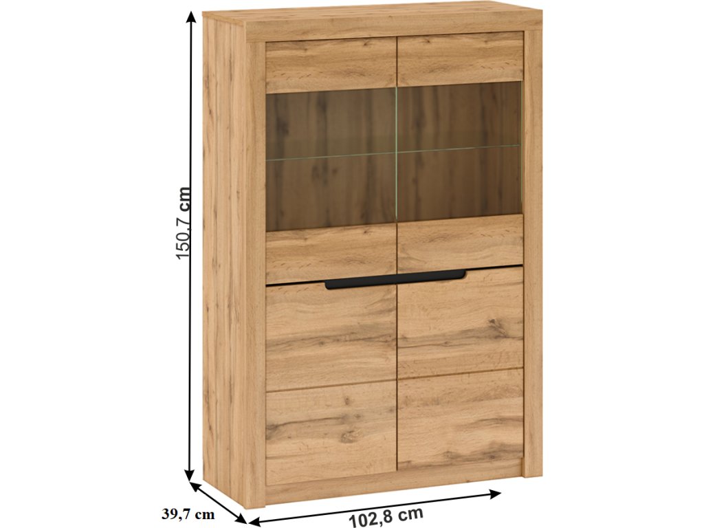 Materiál: DTD laminovaná / MDF Barva: dub Wotan Rozměry (ŠxHxV): 102,8x39,7x150,7 cm Tloušťka materiálu korpus: 16 mm Tloušťka materiálu dvířka: 19 mm čtyřdveřová čtyři skříňky prosklená S policemi Dodávané v demontu.