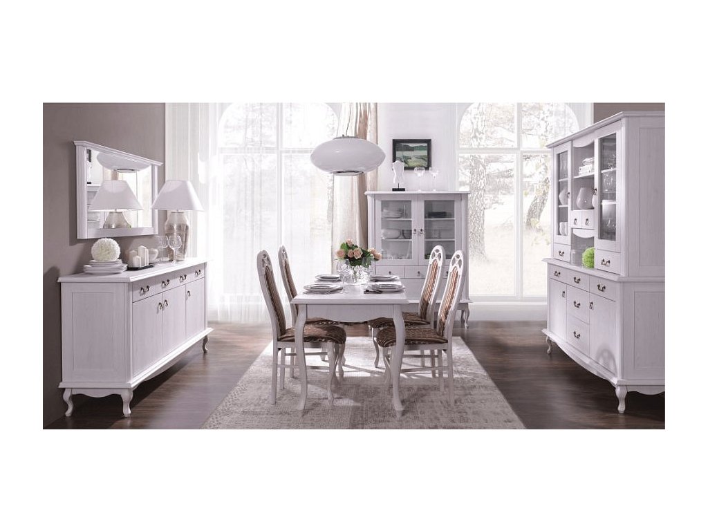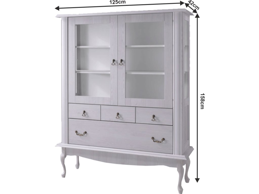 Materiál: DTD laminovaná / ABS hrany Barva: sosna bílá Rozměry (ŠxHxV): 125x42x158 cm Výška spodního prostoru od podlahy: 25 cm Tloušťka materiálu: 30 mm dvoudveřová čtyři šuplíky police 3D efekt kovové úchytky Dřevěné nožičky ABS hrany barokní styl