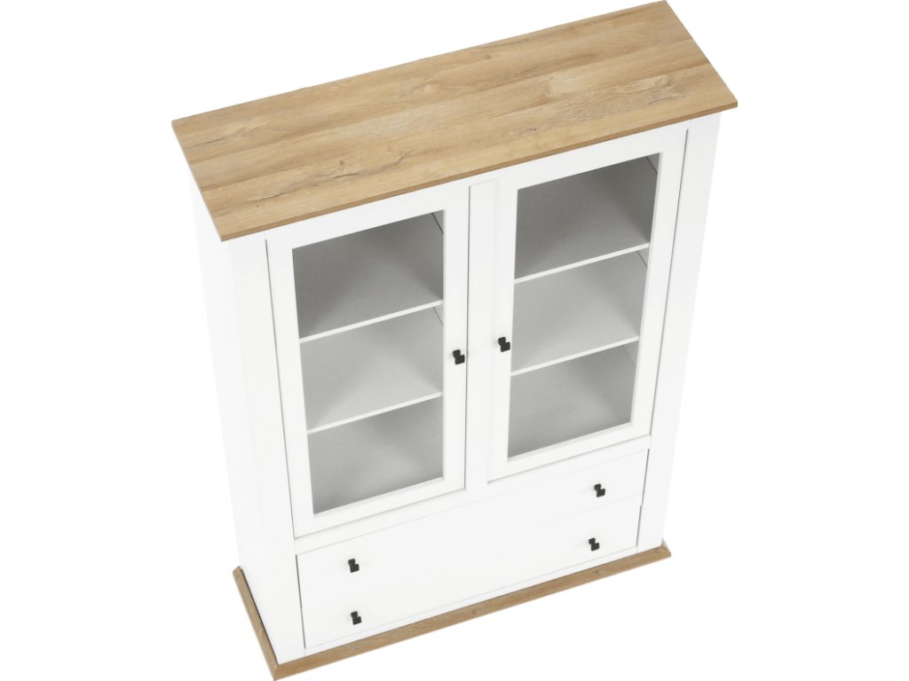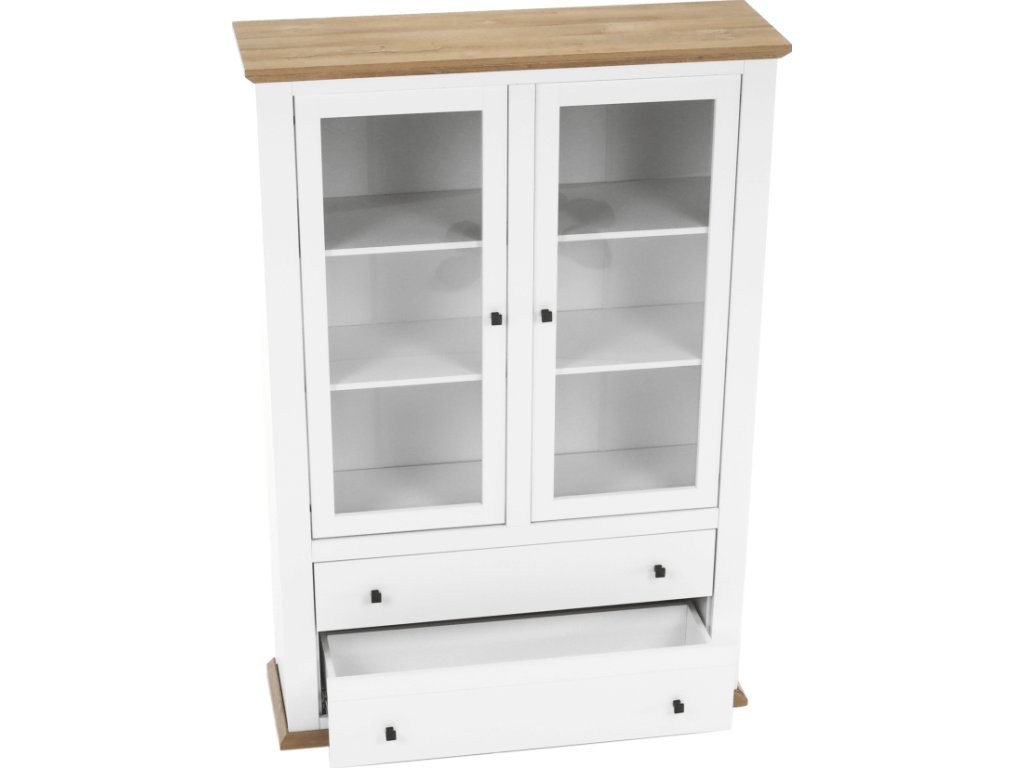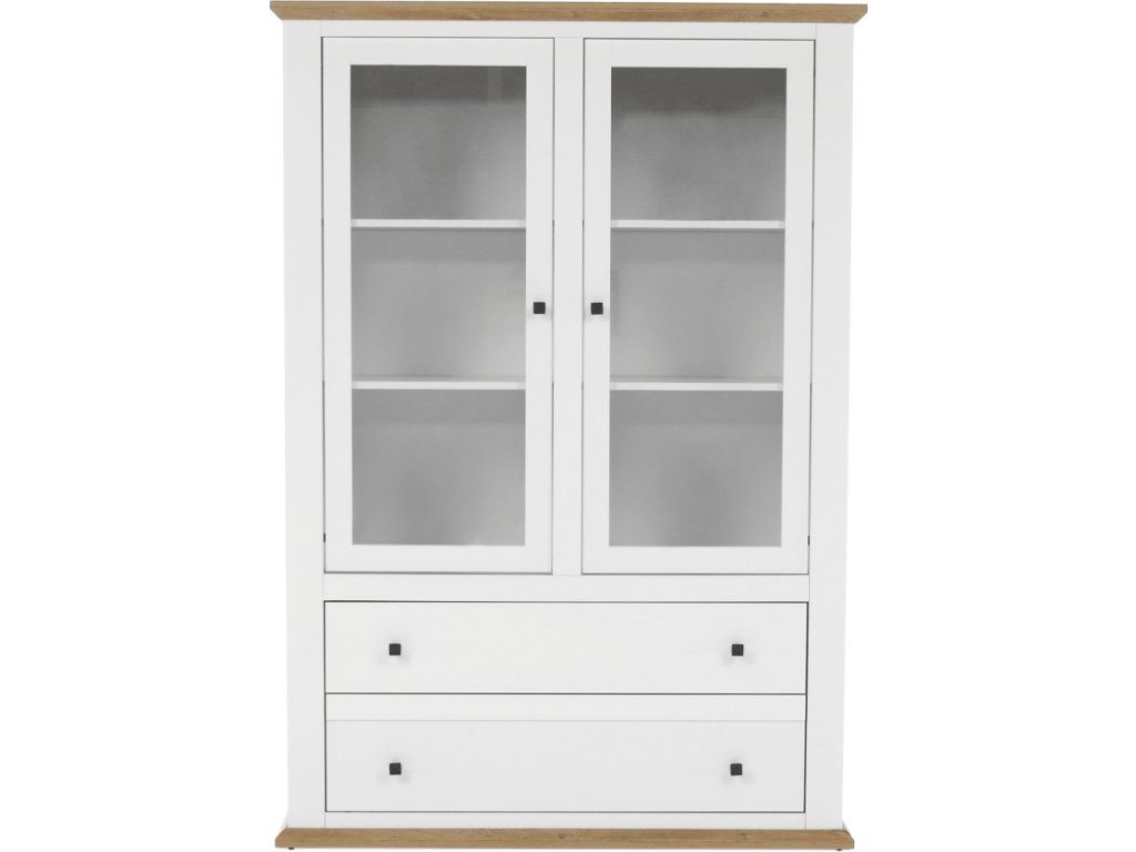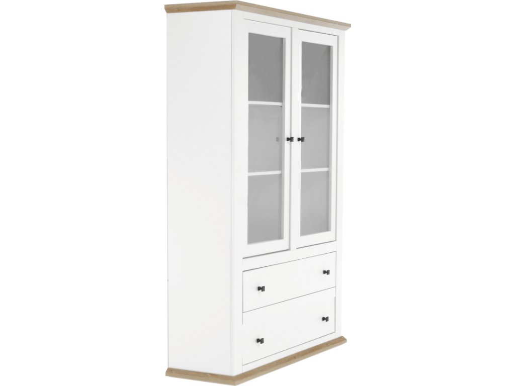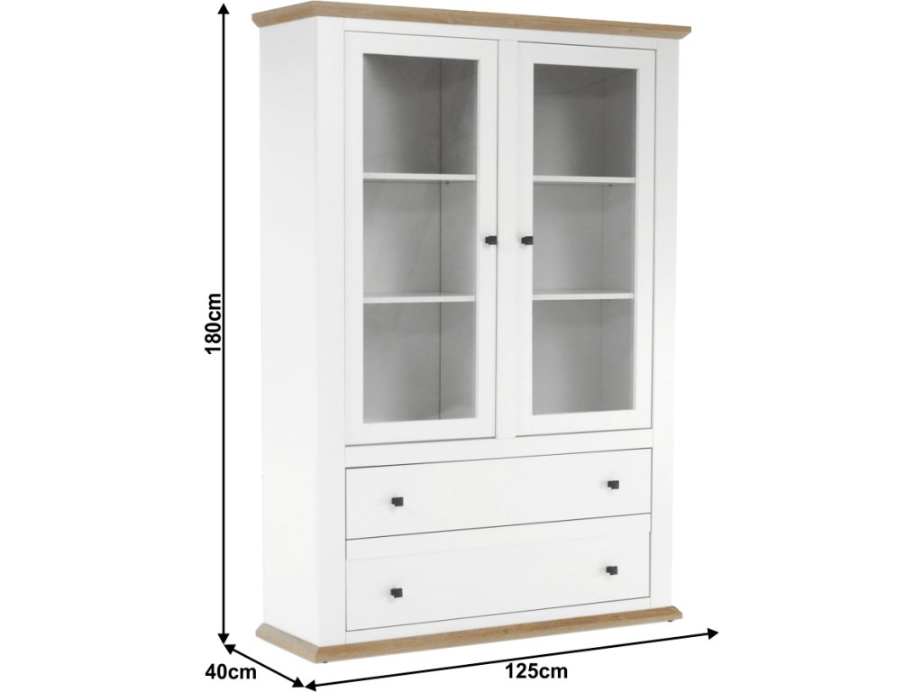 Materiál: DTD laminovaná / ABS hrany Barva: bílá / dub grand Rozměry (ŠxHxV): 125x40x180 cm Tloušťka materiálu: 40 mm dvoudveřová Dveskrinky prosklená S policemi dva šuplíky S úchytkami S 3D efektem elegantní V provensálském stylu kovové úchytky Dodávané v demontu