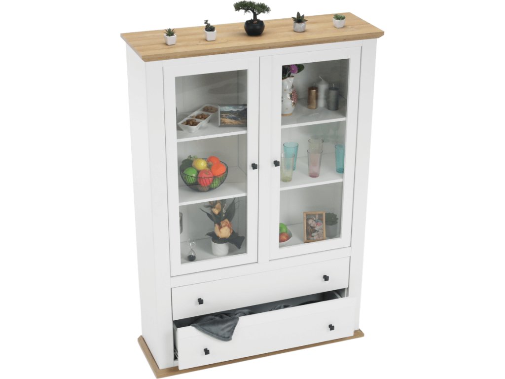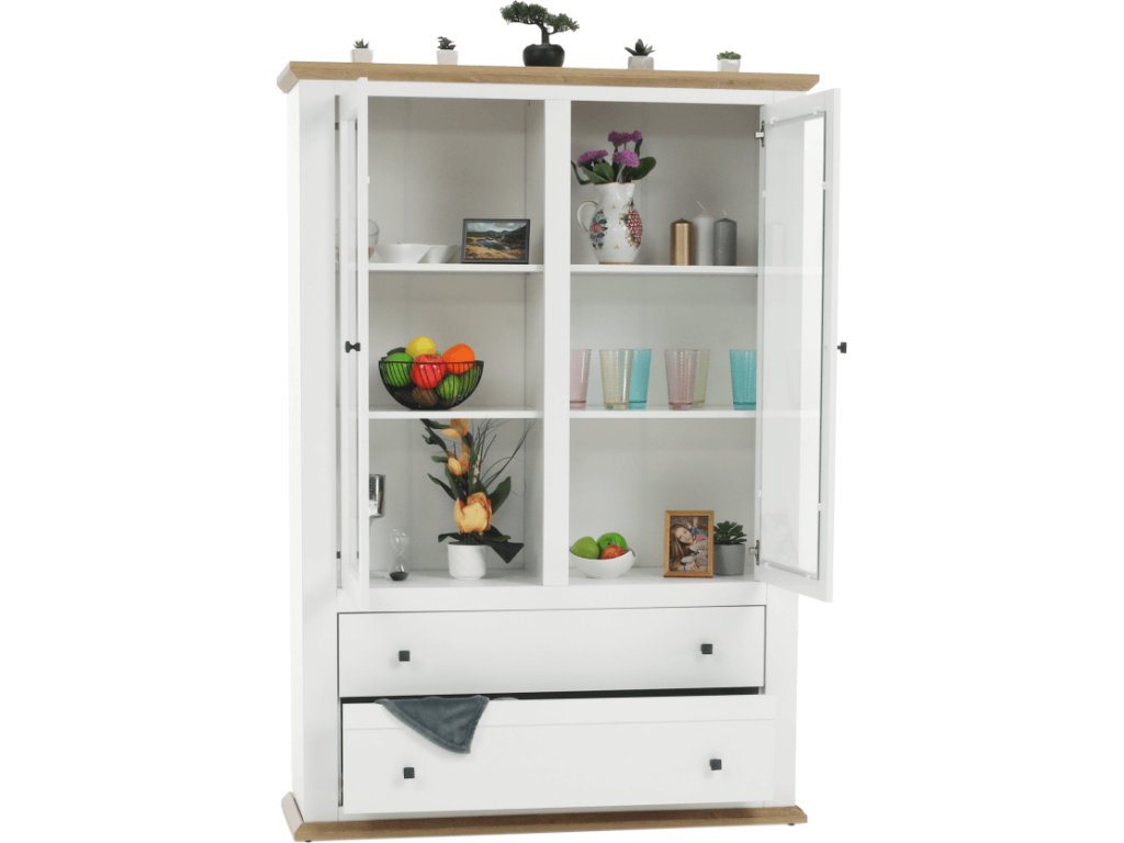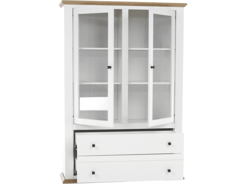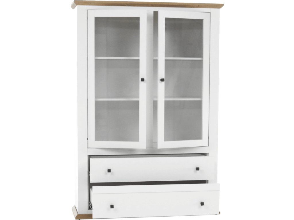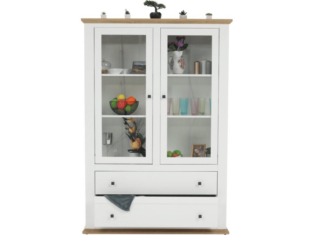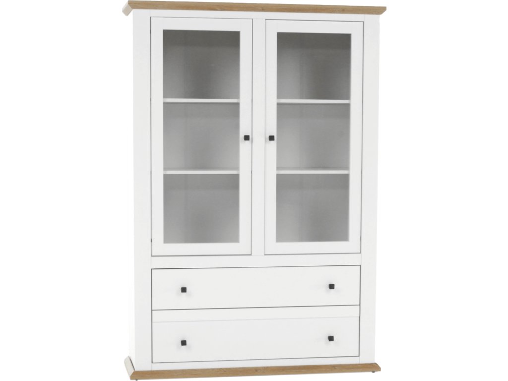 Materiál: DTD laminovaná / ABS hrany Barva: bílá / dub grand Rozměry (ŠxHxV): 125x40x180 cm Tloušťka materiálu: 40 mm dvoudveřová Dveskrinky prosklená S policemi dva šuplíky S úchytkami S 3D efektem elegantní V provensálském stylu kovové úchytky Dodávané v demontu