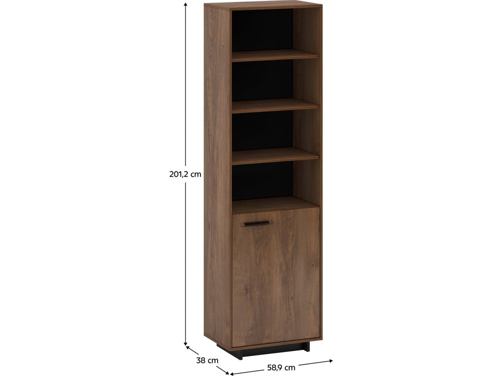 Materiál: DTD laminovaná / MDF Barva: dub bolzano / černá Rozměry (ŠxHxV): 58,9x38x201,2 cm Tloušťka materiálu: 16 mm 1 dvoudveřová skříňka s policí Otevřený úložný prostor pravé provedení na podstavci Výška spodního prostoru od podlahy: 5 cm kovové úchytky originální design Krásná kresba dřeva Do tradičního i moderního interiéru Do obývacího pokoje, pracovny i studentského pokoje Dodávána v demontu