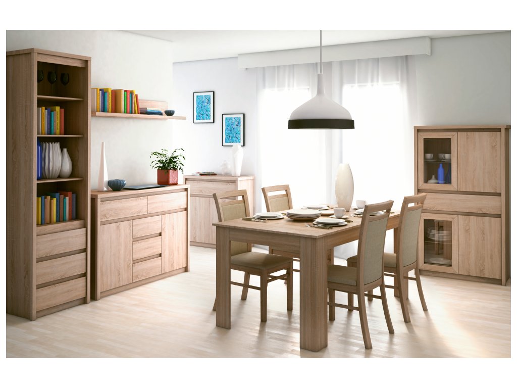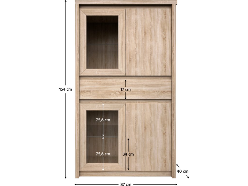 Vitrína s šuplíkem 2W2D1S NORTY TYP 7 Materiál: DTD laminovaná Provedení: dub sonoma Rozměry (ŠxHxV): 87x40x154 cm Tloušťka materiálu: 32 mm Tloušťka materiálu zbývající části: 16 mm Dodávané v demontu.