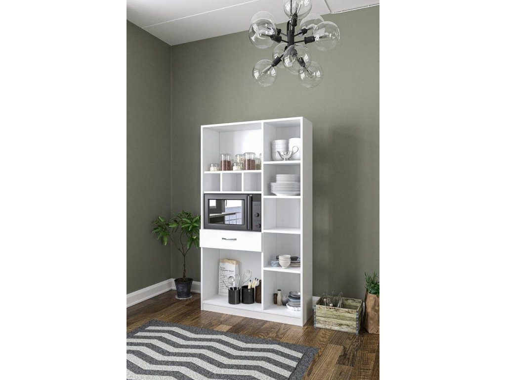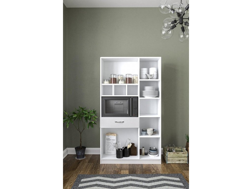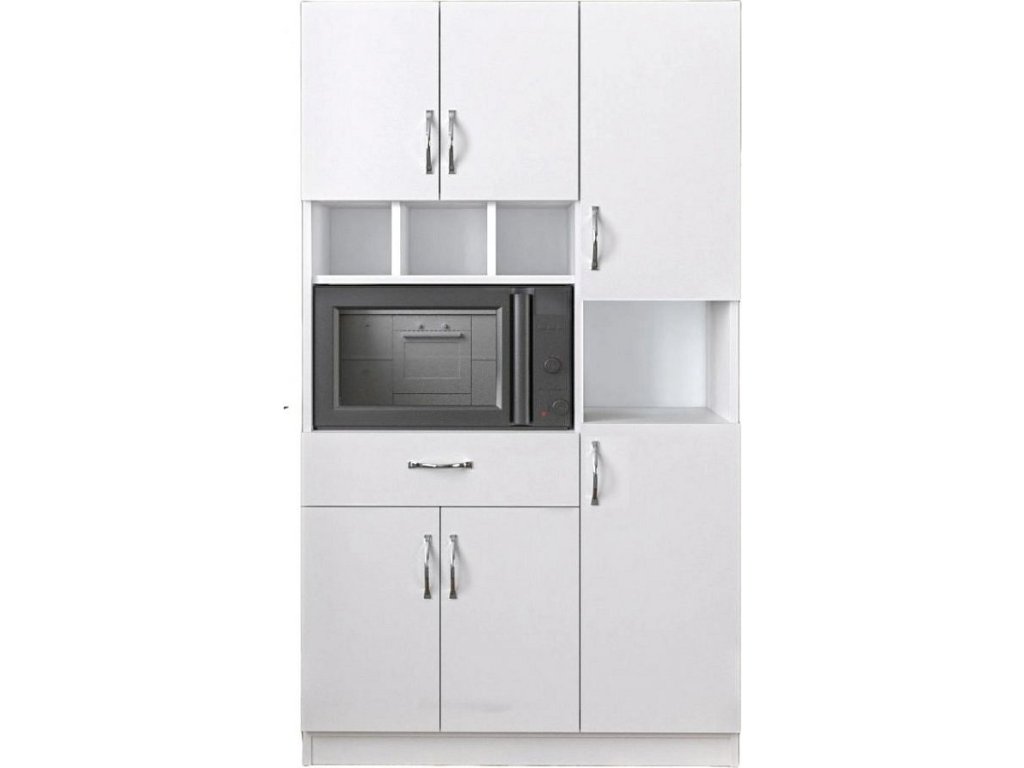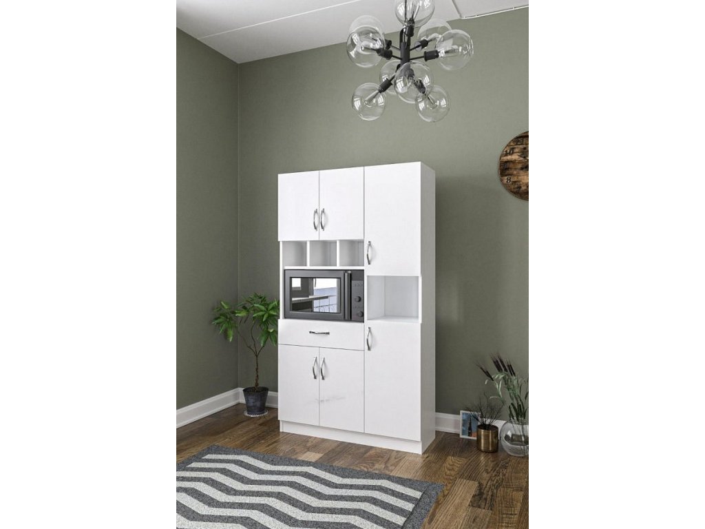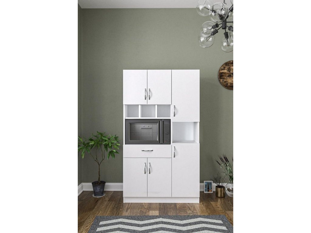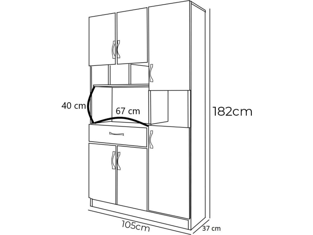Praktické řešení v bílé barvě Výška: 182 cm Šířka: 105 cm Hloubka: 37 cm Rozměr otvoru na mikrovlnku je š67xv45xh36 Skříň disponuje 6 dvířky, 1 šuplíkem a regály. Skříň také nabízí speciální prostor pro mikrovlnku. Vyrobena z kvalitní dřevotřísky potažené melaminem. Dodáváme v demontovaném stavu.Doplňkové parametry