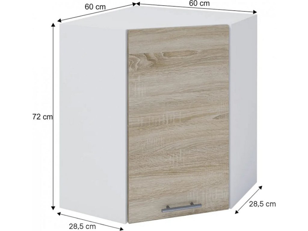 horní rohová skříňka W - 60N, materiál: DTD laminovaná, barevné provedení: dub sonoma / bílá, korpus: bílá, dvířka: dub sonoma. Rozměry ŠxVxH: 60x72x60 cm. Šířka bočních stran: 28,5 cm Tloušťka materiálu: 16 mm Dodáváno v demontu. Možnost zakoupení pracovní desky Fabiana Metalic brown šedá s tloušťkou 2,8 cm, šířkou 60 cm a cenou za bm 1.190 Kč. Možnost dokoupení univerzálního L / P dřezu LAY ON.