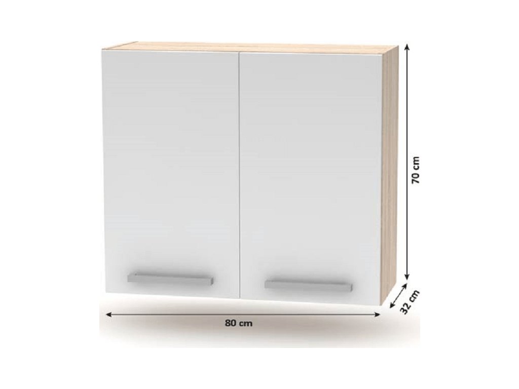 Horní skříňka 2DV, NOPL-014-OH Materiál: DTD laminovaná Barva: dub sonoma / bílá Rozměry (ŠxHxV): 80x32x70 cm Tloušťka materiálu: 16 mm Kvalitní slovenský výrobek. Dodávané v demontu. Skříňky ke kuchyni NOVA PLUS jsou dodávány bez pracovní desky. Pracovní desku v provedení granit antracit v tloušťce 38 mm lze doobjednat. Možnost dokoupení univerzálního L/P dřezu LAY ON.