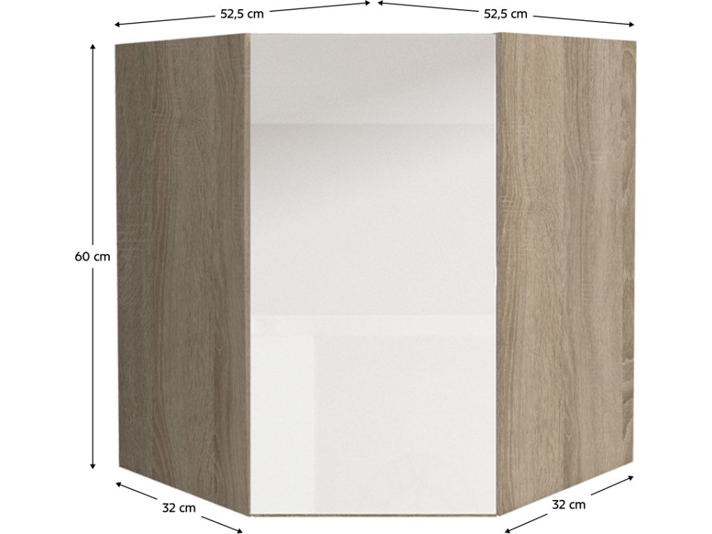 Horní rohová skříňka GR LINE Materiál: DTD laminovaná Provedení: vysoký bílý lesk / dub sonoma Rozměry (ŠxHxV): 52,5x52,5x60 cm S dvířky úložný prostor moderní design Dodávané v demontu. Možnost dokoupit dřez v ceně 2.190 Kč. Možnost dokoupit pracovní desku 38 mm v ceně 1.440 Kč / bm.