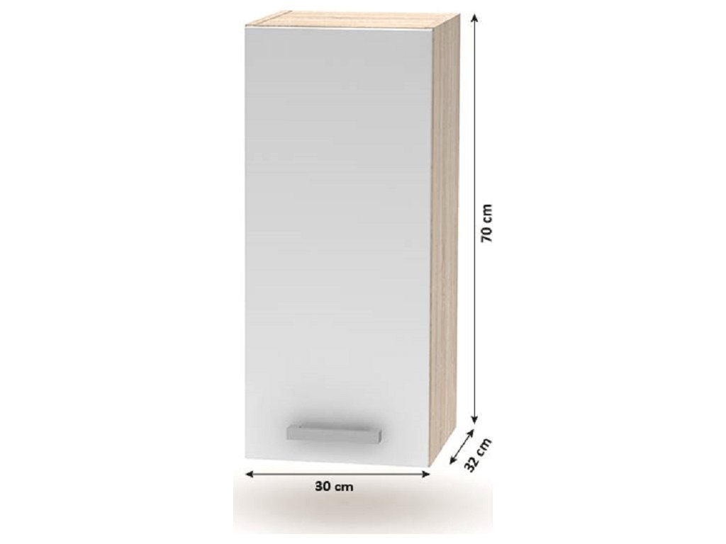 Horní skříňka 30 1DV, NOVA PLUS NOPL-002-OH Materiál: DTD laminovaná Barva: dub sonoma / bílá Rozměry (ŠxHxV): 30x32x70 cm Tloušťka materiálu: 16 mm Dodávané v demontu. Kvalitní slovenský výrobek. Skříňky ke kuchyni NOVA PLUS jsou dodávány bez pracovní desky. Pracovní desku v provedení granit antracit v tloušťce 38 mm lze doobjednat. Možnost dokoupení univerzálního L/P dřezu LAY ON.