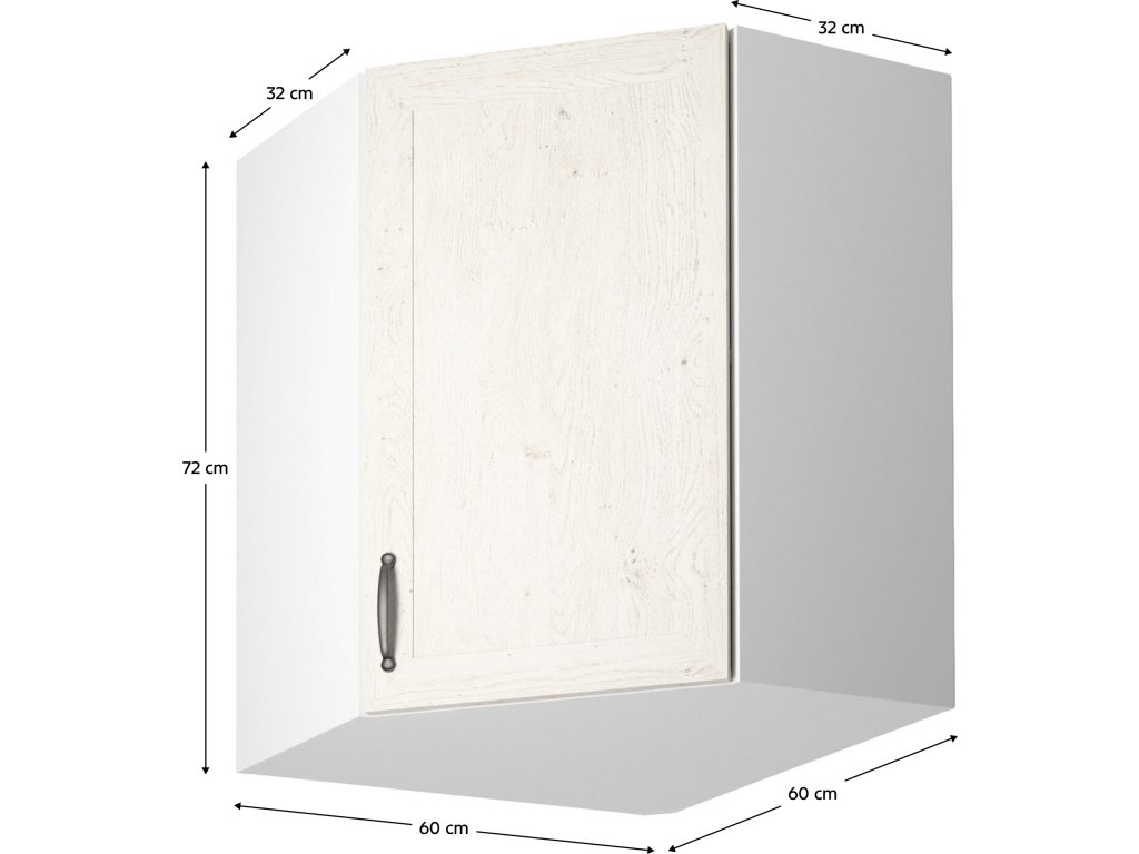 Horní rohová skříňka s dvířky, ROYAL G60N Materiál: korpus je vyroben z kvalitní laminované dřevotřísky / kovová úchytka Barva: bílá / dvířka v provedení sosna skandinávská Rozměry ŠxHxV: 60x60x72 cm Tloušťka materiálu: 15 mm Dodávané v demontu. Spodní skříňky ke kuchyni ROYAL jsou dodávány bez pracovní desky a bez soklu. Cena za pracovní desku Rockpile 38 mm 1.350,-Kč bm, ke každé dolní skříňce (kromě D25PZ) je nutno objednat 2ks úchytů na sokl - cen 20,-Kč / 2ks, sokl (1 m) 240,-Kč / bm.
