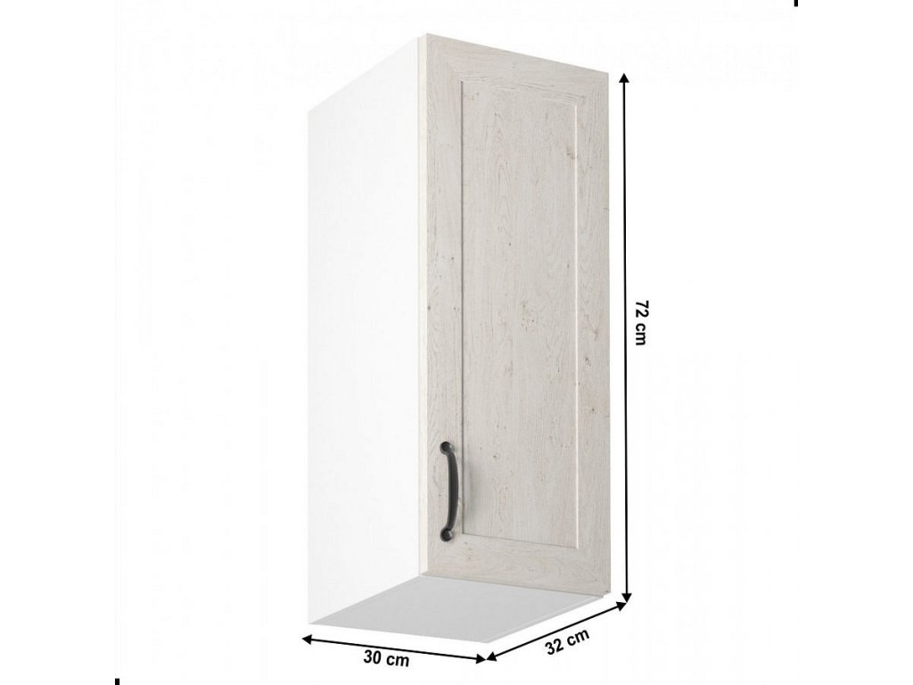 Horní skříňka s dvířky, ROYAL G30, pravá Materiál: korpus je vyroben z kvalitní laminované dřevotřísky / kovová úchytka Barva: bílá / dvířka v provedení sosna skandinávská Rozměry ŠxHxV: 30x32x72 cm Tloušťka materiálu: 15 mm Dodávané v demontu. Spodní skříňky ke kuchyni ROYAL jsou dodávány bez pracovní desky a bez soklu. Cena za pracovní desku Rockpile 38 mm 1.350,-Kč bm, ke každé dolní skříňce (kromě D25PZ) je nutno objednat 2ks úchytů na sokl - cen 20,-Kč / 2ks, sokl (1 m) 240,-Kč / bm.