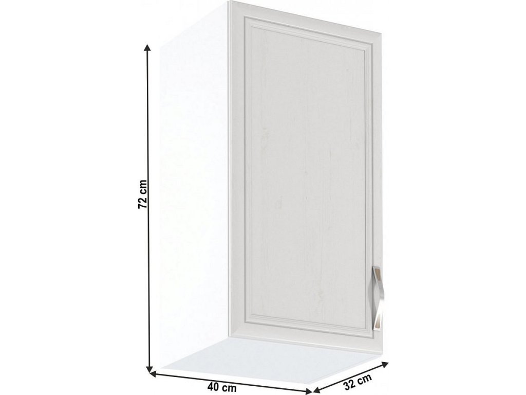 Horní skříňka G40 levá ke kuchyni SICILIA Provedení: DTD laminovaná/MDF lišty Barva: bíla/sosna Andersen Rozměry (ŠxHxV): 40x32x72 cm Tloušťka materiálu: 15 mm Spodní skříňky jsou dodávány bez pracovní desky. Můžete si objednat pracovní desku pískovec k provedení ořech Milano - tloušťka 28mm nebo pracovní desku dub Lancelot k provedení sosna andersen - tloušťka 38 mm.