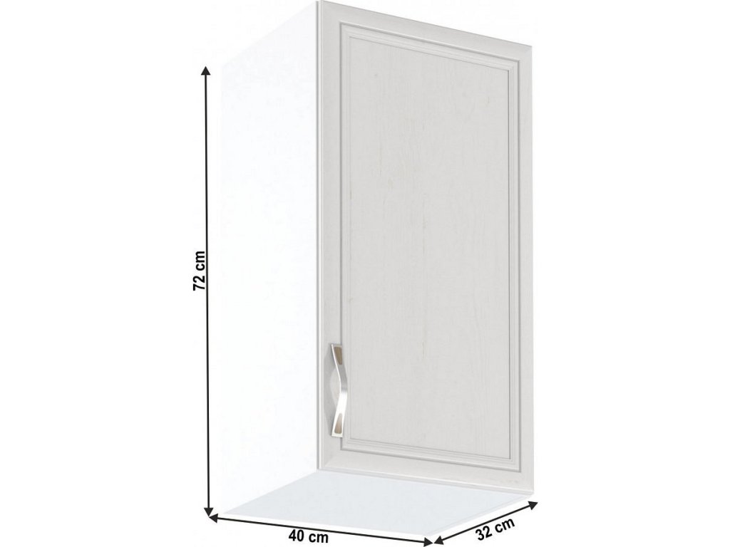 Horní skříňka G40 pravá ke kuchyni SICILIA Provedení: DTD laminovaná/MDF lišty Barva: bíla/sosna Andersen Rozměry (ŠxHxV): 40x32x72 cm Tloušťka materiálu: 15 mm Spodní skříňky jsou dodávány bez pracovní desky. Můžete si objednat pracovní desku pískovec k provedení ořech Milano - tloušťka 28mm nebo pracovní desku dub Lancelot k provedení sosna andersen - tloušťka 38 mm.