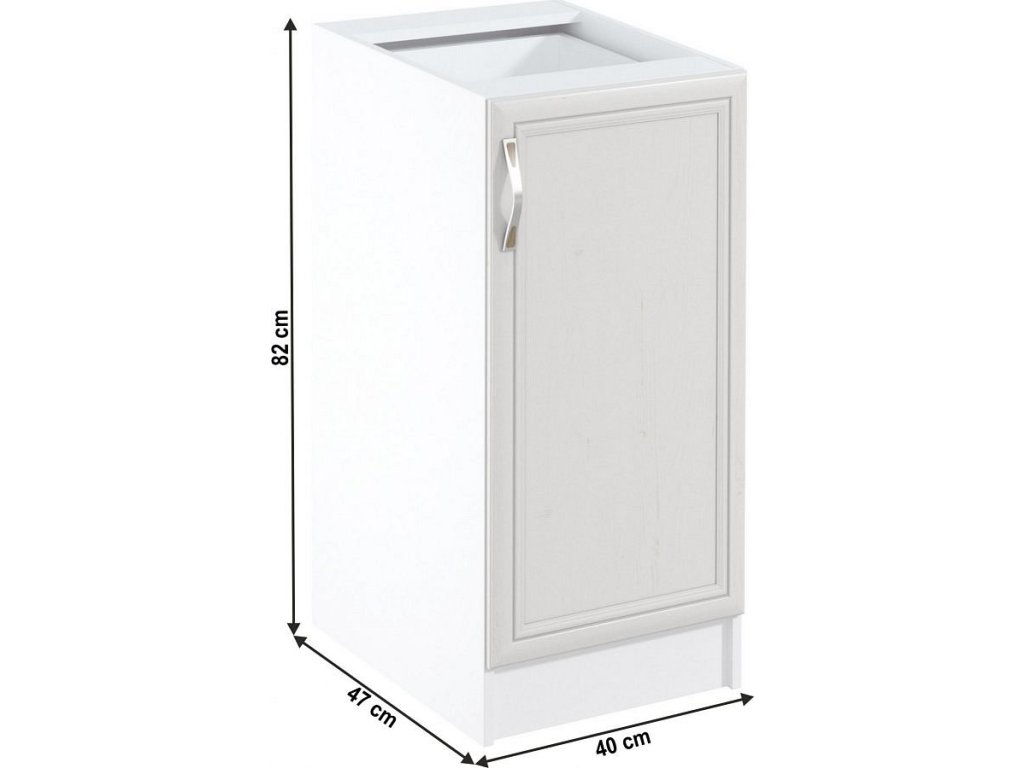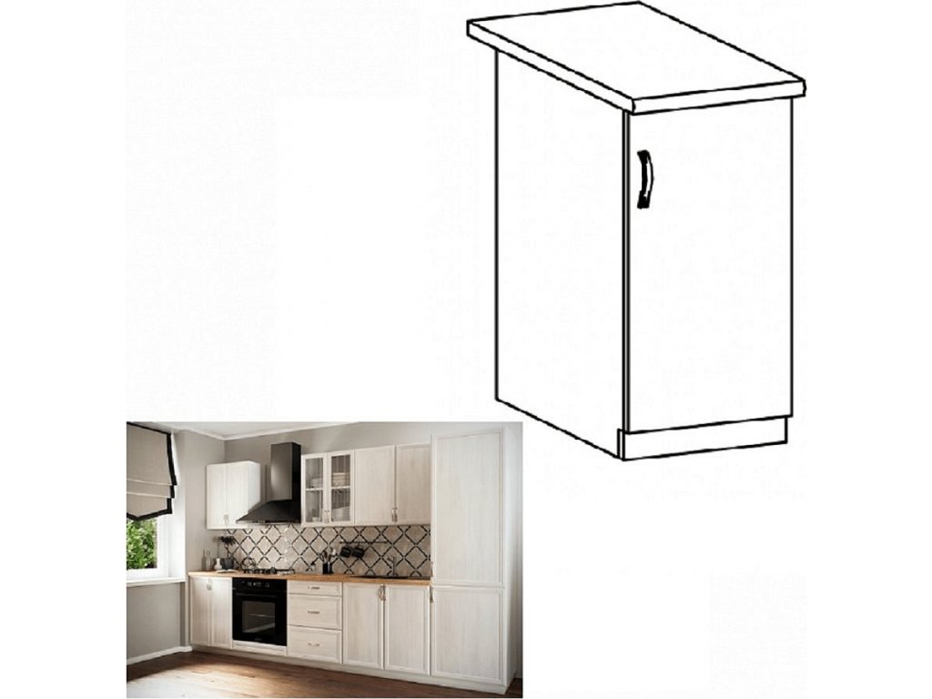 Spodní skříňka D40 s dvířky, pravá ke kuchyni SICILIA Provedení: DTD laminovaná/MDF lišty Barva: bíla/sosna Andersen Rozměry (ŠxHxV): 40x47x82 cm Tloušťka materiálu: 15 mm Spodní skříňky jsou dodávány bez pracovní desky. Můžete si objednat pracovní desku pískovec k provedení ořech Milano - tloušťka 28mm nebo pracovní desku dub Lancelot k provedení sosna andersen - tloušťka 38 mm.
