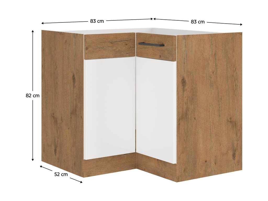 Spodní skříňka rohová VEGA DN 1F BB Materiál: DTD laminovaná / MDF Barva: dub lancelot / bílá extra vysoký lesk HG Rozměry (ŠxHxV): 83 / 83x52x82 cm Skříňka bez pracovní desky Systém tichého dorazu dvířek Včetně spodní lišty Dodávané v demontu Spodní skříňky jsou dodávány včetně dolní lišty, bez pracovní desky. Možnost dokoupit pracovní desku dub lancelot v ceně: 1.290, - Kč / m. Možnost dokoupit univerzální L / P dřez v ceně 2.190, - Kč.