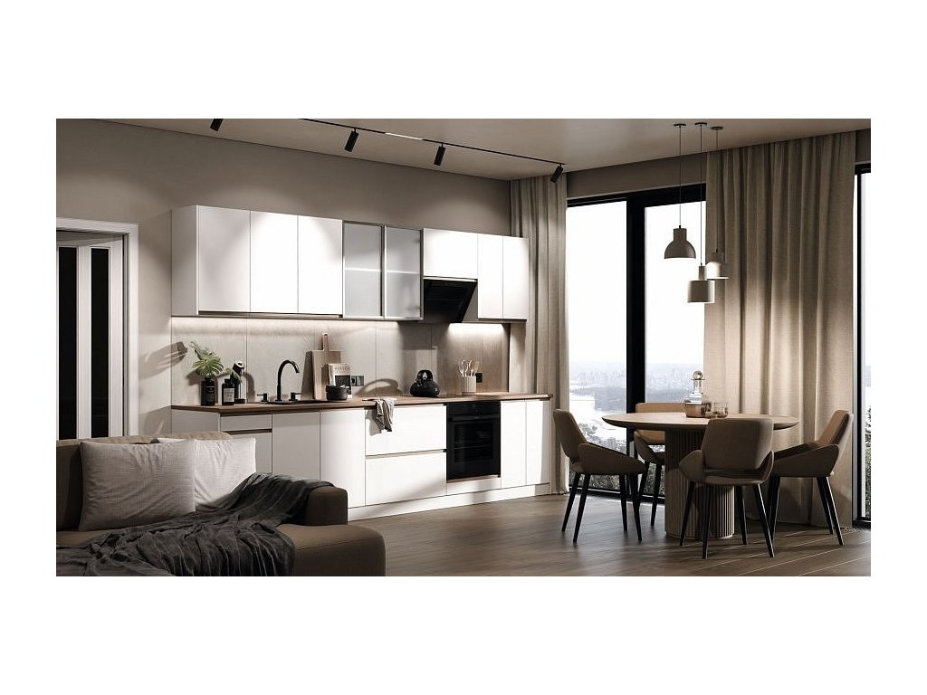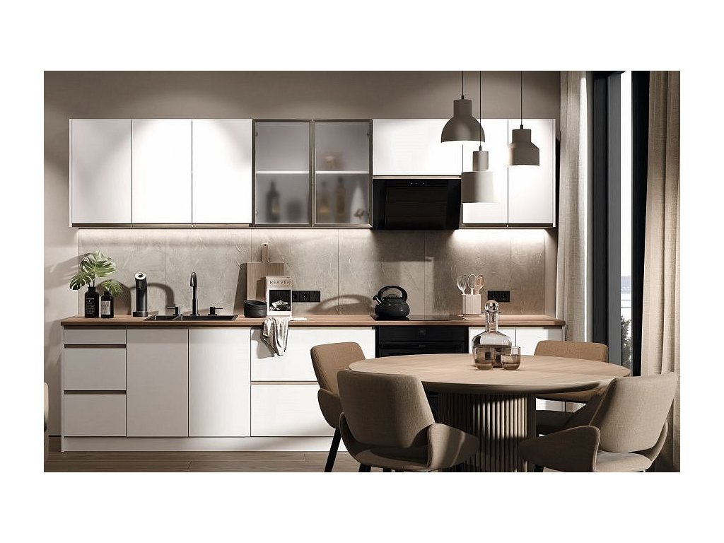 Skříňky kuchyňské linky jsou vyrobeny z kvalitní 18 mm LTD desky. Spodní skříňky mají výškově nastavitelné nožičky. Kovový rám dvířek prosklené horní skříňky je v odstínu champagne. Kuchyňská linka disponuje bezúchytovým systémem otevírání dvířek, což umožňují vyfrézovaná dvířka. (viz.foto)
