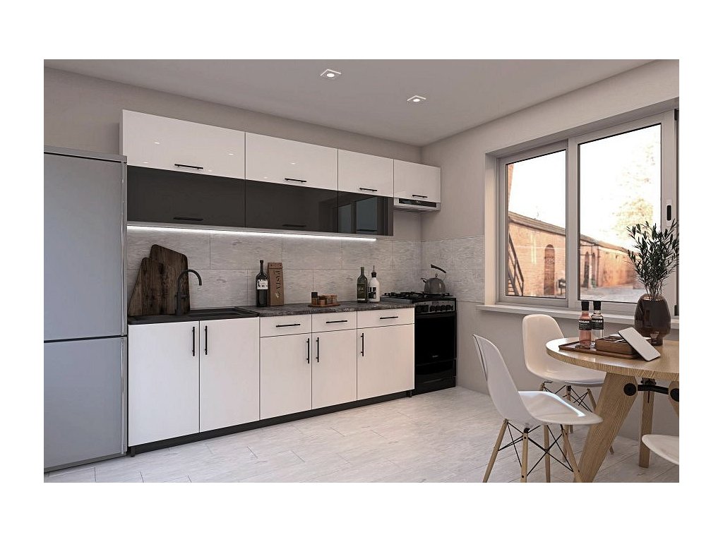 Moderní a levná kuchyně. Tato kuchyně je navržena tak, že skříňky se dají poskládat v libovolném pořadí. To vám umožní si sestavit kuchyni podle svých představ. Korpus je v bílé barvě, části dvířek jsou v bílé lesk a antracit lesk. Nožky jsou regulovatelné. Sokl, pracovní deska, spotřebiče, dřez a digestoř v ceně nejsou.