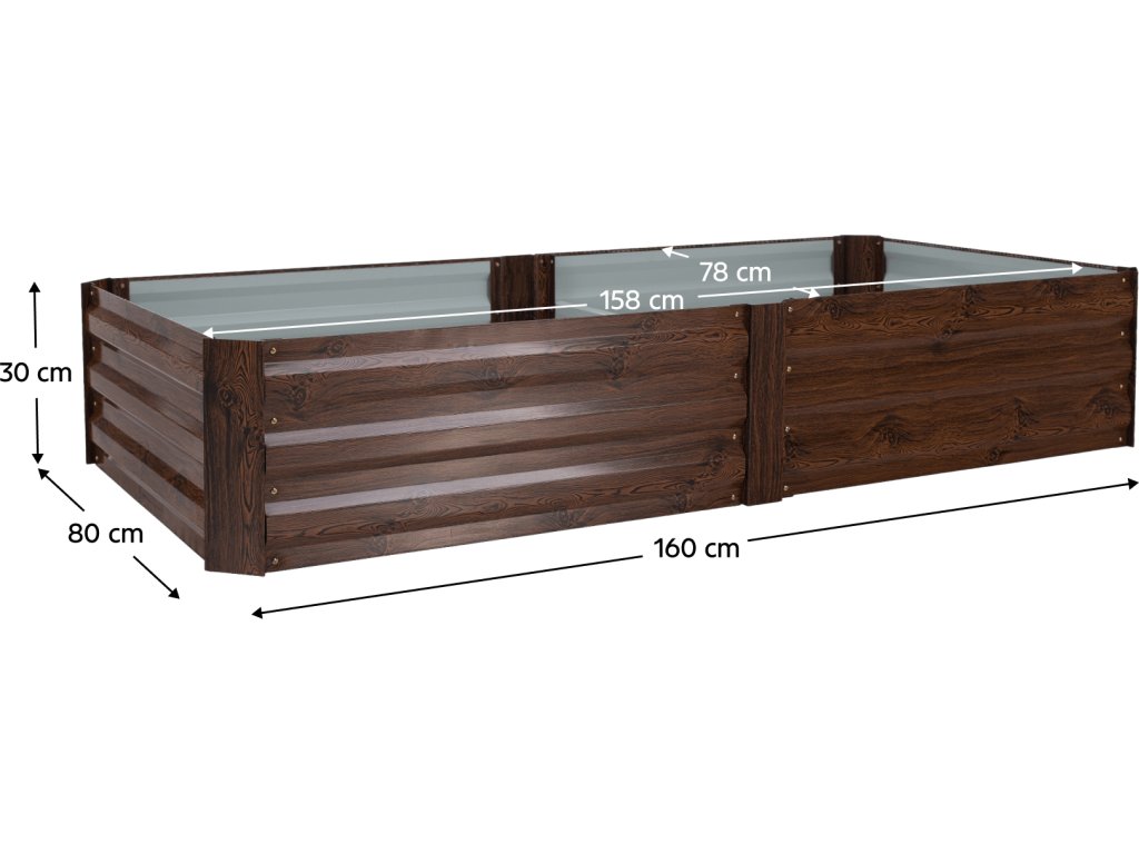 Materiál záhon: ocel/hliník Barva: hnědá/vzor dřevo Vnější rozměry (ŠxHxV): 160x80x30 cm Vnitřní rozměry(ŠxHxV): 155x75x30 cm Tloušťka materiálu: 0,3 mm, roh 0,8 mm Vhodný do interiéru i exteriéru Dodáván bez dna/podlahy Jednoduchá montáž Ocel s povrchovou práškovou úpravou Na bylinky, květiny nebo zeleninu Pro rostliny s rozdílnými nároky na pěstování Vyšší ochrana před hlemýždi Nízká náchylnost k růstu plevelů Ideální do míst s půdou chudou na živiny Vhodný i pro nejmenší zahrady Moderní design Všestranné využití Vhodný jako dárek Dodáván v demontu