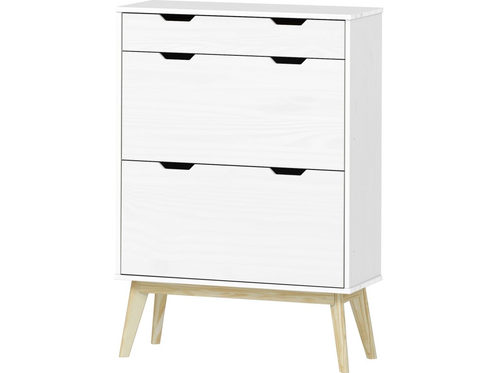 materiál masiv borovice, barevné provedení bílý lak 1 zásuvka s kovovými pojezdy, 2 dvouřadé výklopy