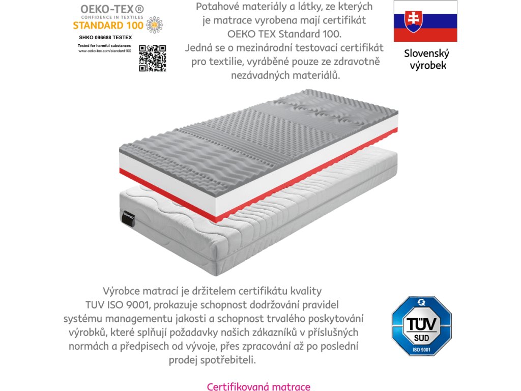 Kvalitní sendvičová matrace z PUR pěny. Speciální tvarování matrace a dokonalé provzdušnění jádra. Lepené jádro matrace technologií Hotmelt - tavné lepidlo je zdravotně nezávadné. Dvě tvrdosti matrace: tvrdší a měkčí strana. Potah ve verzi Chloe Activ. Praní při teplotě do 60 ° C. Výška matrace je 18 cm. Tvrdost matrace: středně tvrdý . K matraci doporučujeme zakoupit lamelový rošt. Barva PUR pěny se může lišit Nosnost: 120 kg