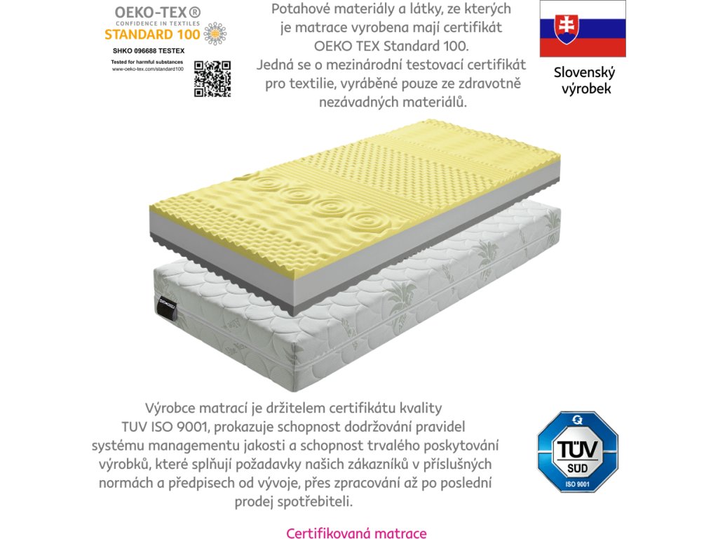 Sendvičová pěnová matrace MATRACE BE TEMPO VISCO Materiál: PUR pěna/paměťová pěna Rozměry (ŠxD): 160x200 cm Výška matrace: 18 cm Tvrdost matrace: středně tvrdý Nosnost: 120 kg Se sedmi zónami. Praní při teplotě 60 ° C. Se zipem. Barva pěny se může lišit Kvalitní slovenský výrobek.