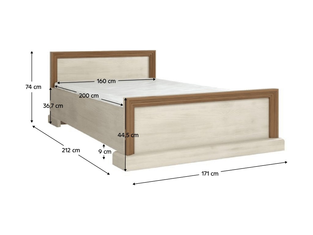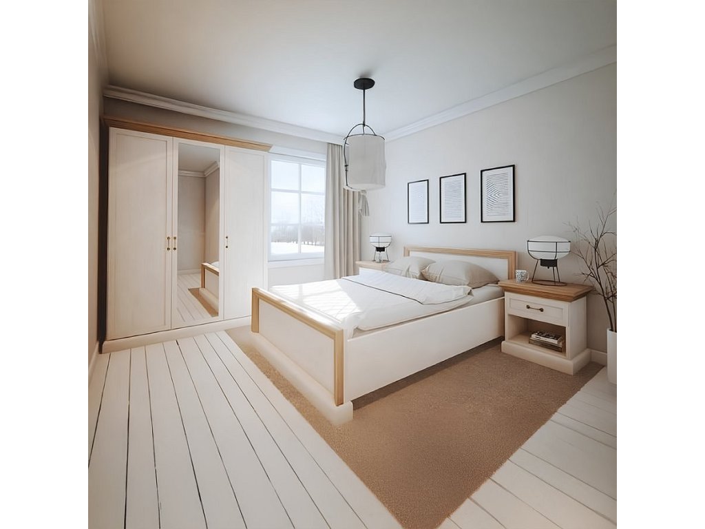 Materiál: laminovaná DTD/kov Barva: bílá sosna nordická/dub divoký Skříň Rozměry (ŠxHxV): 157x60x197 cm 3dveřová 1x dveře se zrcadlem Uvnitř skříně 3 police Postel Rozměry (ŠxHxV): 171x212x74 cm Postel dodávána s roštem, bez matrace Výška po rošt: 24 cm Doporučujeme zakoupit matraci s minimální výškou 13 cm Výška od roštu po rám dřeva je 11 cm Noční stolek Rozměry (ŠxHxV): 57x40x50 cm Tloušťka materiálu korpus: 1,5 cm Tloušťka materiálu vrchní desky: 2,2 cm Kovové úchytky Ozdobné lišty Dodáváno v demontu