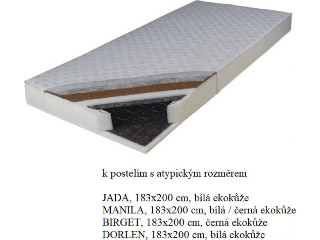 Matrace jednostranný KOKOS MEDIUM ATYP Rozměry (ŠxD): 183x200cm Výška matrace: 16 cm Materiál: Bonelové pružiny / polyuretanová pěna / latexová kokosová deska / bavlněný potah Nosnost: molitanové strany je 80kg a kokosové strany je 100kg. Tvrdost matrace: středně tvrdý T3/tvrdý T4 Matrace je v atypickém rozměru 183x200 cm. Je speciálně vyroben k postelím s takovým vnitřním rozměrem. Matrace doporučujeme k postelím: postel JADA, 180x200 cm, ekokůže bílá postel MANILA, 180x200 cm, ekokůže bílá / černá postel BIRGET, 180x200 cm, ekokůže černá postel DORLEN, 180x200 cm, ekokůže bílá